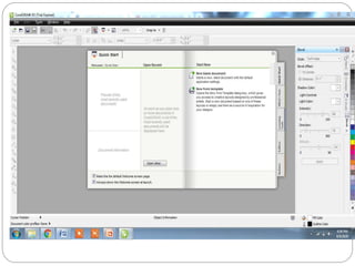 CorelDRAW is a vector-based graphic design software developed by Corel Corporation, ideal for creating professional artwork such as logos and brochures. It offers a variety of tools and effects for efficient graphic production and features like toolboxes, menu bars, and document palettes for user convenience. The software supports both import and export options, providing a user-friendly interface for managing complex designs.