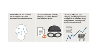The document discusses the rise and importance of data science and machine learning, highlighting the growing demand for data scientists and the challenges they face. It explains machine learning concepts such as supervised and unsupervised learning, along with various real-world applications and the necessary steps involved in a machine learning workflow. Additionally, the document emphasizes the iterative process of model improvement and feature engineering used to enhance machine learning outcomes.