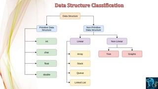 The document provides an overview of data structures, defining them as specialized formats for organizing and storing data efficiently, emphasizing their importance in programming. It discusses different types of data structures, including primitive and non-primitive forms, and highlights key operations performed on them. The need for efficient data structures is underscored by challenges in handling large data volumes, search efficiency, and multiple user requests.
