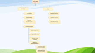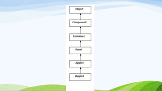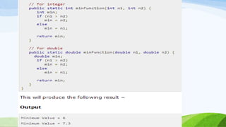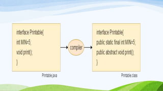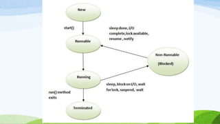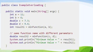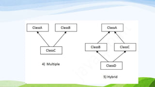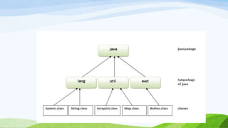 This document provides an introduction to object-oriented programming concepts in Java including objects, classes, inheritance, polymorphism, and more. It defines key terms like class, object, state, behavior, identity. It also discusses the differences between objects and classes and provides examples of declaring classes and creating objects in Java. Methods, constructors, and initialization of objects are explained. Inheritance, method overriding, and polymorphism are defined along with examples.