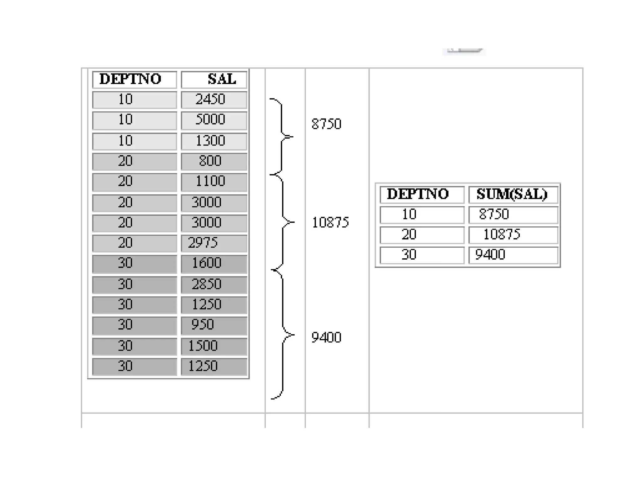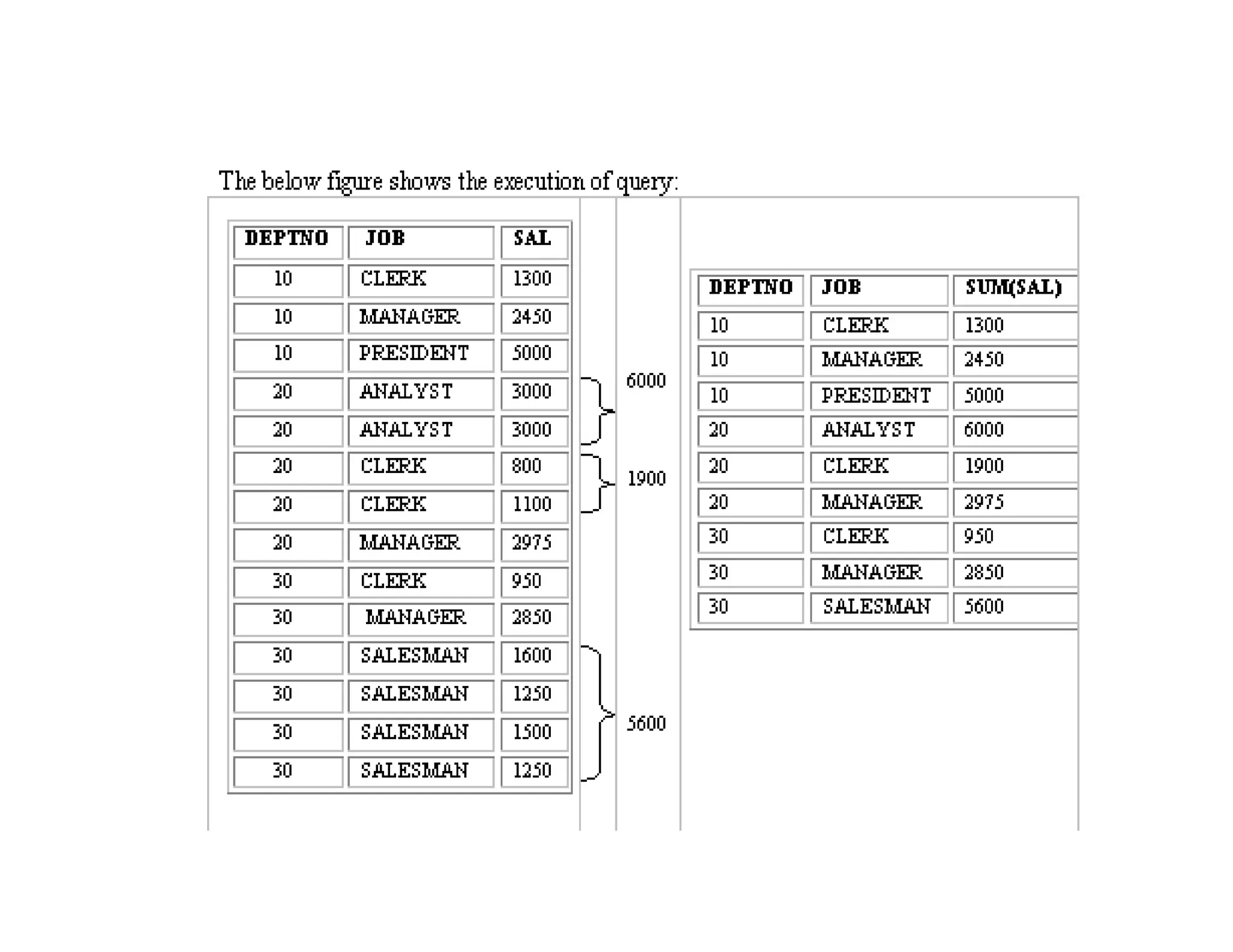 SQL>SELECT job, SUM(sal), avg(sal), max(sal), min(sal) from