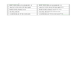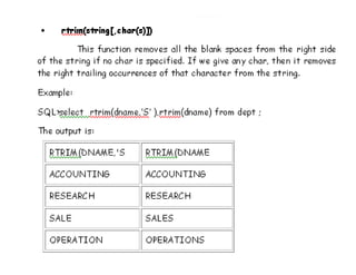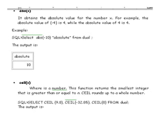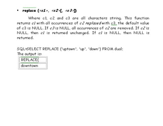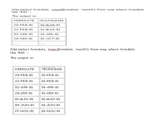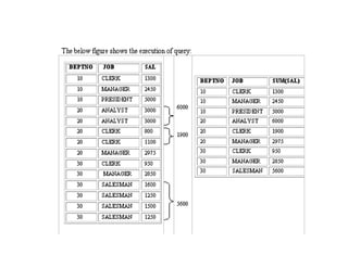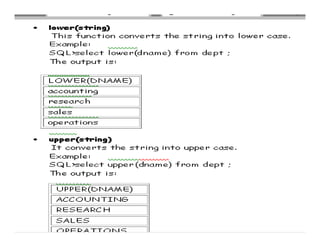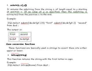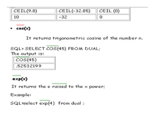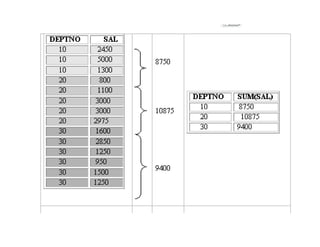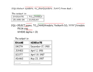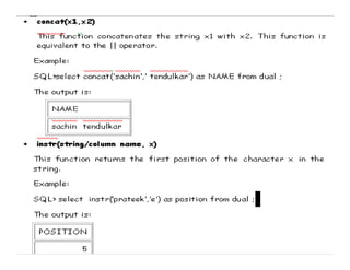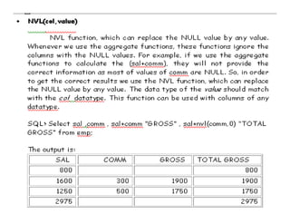 Functions in Oracle can be used to manipulate data values and are categorized as single-row/scalar functions and group/aggregate functions. Single-row functions operate on each row and return one value per row, while group functions operate on sets of values to return one result. The GROUP BY clause is used to group or categorize data and can be used with aggregate functions to return summary results for each group.