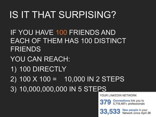 This document provides an overview of a 4-day training on the Social Semantic Web. It introduces the topic and goals of being comfortable with the Social Semantic Web. The agenda outlines sessions on introductions to social networks and semantic web, applications and technologies for the Social Semantic Web, challenges and the future. Statistics are presented on the growth of social media and user generated content. Concepts discussed include blogs, wikis, microblogging, and social networking services. Milgram's theory of six degrees of separation and its examples like the Erdos number and six degrees of Kevin Bacon are also mentioned.