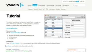 Vaadin is a Java-based web application framework that allows building server-side user interfaces for web apps. It provides rich web components that are rendered on the server and optimized for performance. Vaadin handles communication between the client and server so developers work in Java and build UIs declaratively without JavaScript. The document introduces key concepts of Vaadin like its building block components, server-side architecture, and support for any Java backend or technology.