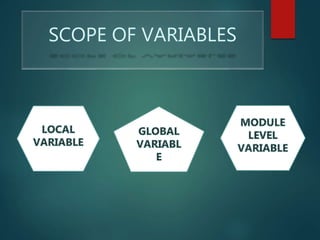 Visual Basic 6.0 is an event-driven programming language created by Microsoft, aimed at allowing beginners to develop GUI applications easily. The document outlines its history, features, advantages, and the various types of applications that can be created, along with an overview of its integrated development environment. It also details several editions of Visual Basic and their intended user bases, highlighting the simplicity and effectiveness of the language for rapid application development.