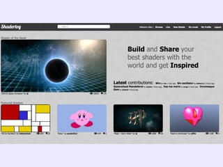 The document discusses WebGL and graphics pipelines. It explains that WebGL allows hardware-accelerated 3D graphics on websites without plugins by using the browser's GPU. It also introduces Three.js, a library that builds upon WebGL to make it easier to use. The document then provides examples of vertex and fragment shaders to manipulate 3D objects by transforming coordinates and applying textures and lighting.
