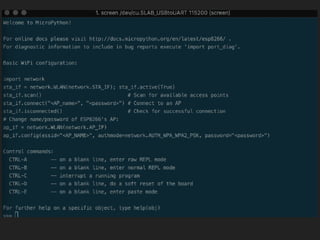 MicroPython is a lean and efficient implementation of Python 3 that runs on microcontrollers and embedded systems. The document discusses installing MicroPython on an ESP8266 board, connecting sensors like a DHT11 temperature and humidity sensor to the board, and communicating sensor data to a Home Assistant server using MQTT messaging to build an IoT system with end-to-end Python code.