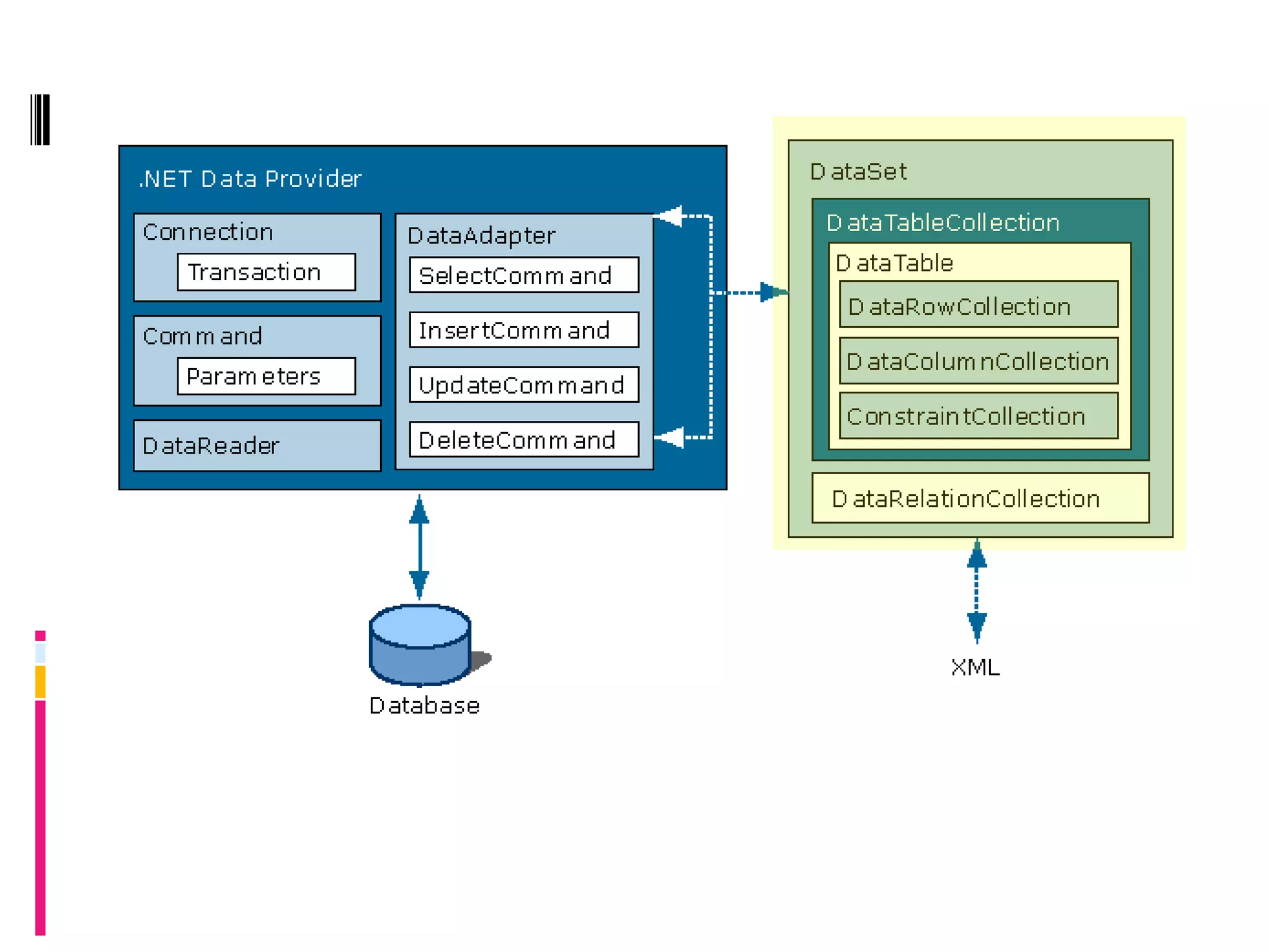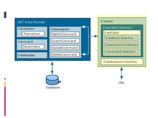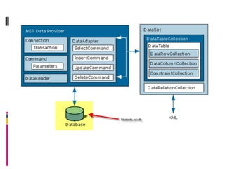 ADO.NET Previously applications would talk to Database using SQL  The application would be constantly connected to the DB  We still use SQL but the data is disconnected  It will connect to a database server when it needs to run a query and then disconnects immediately  ADO.NET still provides the connection oriented traditional approach.