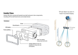 The document outlines the fundamentals of virtual reality (VR) and augmented reality (AR), emphasizing key concepts such as immersion, interaction, and presence. It discusses the sensory input mechanisms crucial for creating realistic experiences in XR environments, including human visual and auditory systems, as well as the challenges related to motion sickness and system latency. Additionally, it explores the technological advancements needed for life-like VR displays and the importance of understanding human perception in XR design.