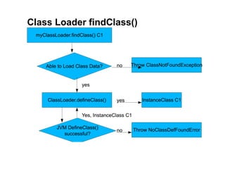 The document discusses Java class loaders and their security features, detailing the phases of class loading, different types of class loaders, and common exceptions encountered. It provides insights into debugging class loader problems and the importance of securing code during class loading. Additionally, the document includes resources for further reading on Java language specifications and security architecture.