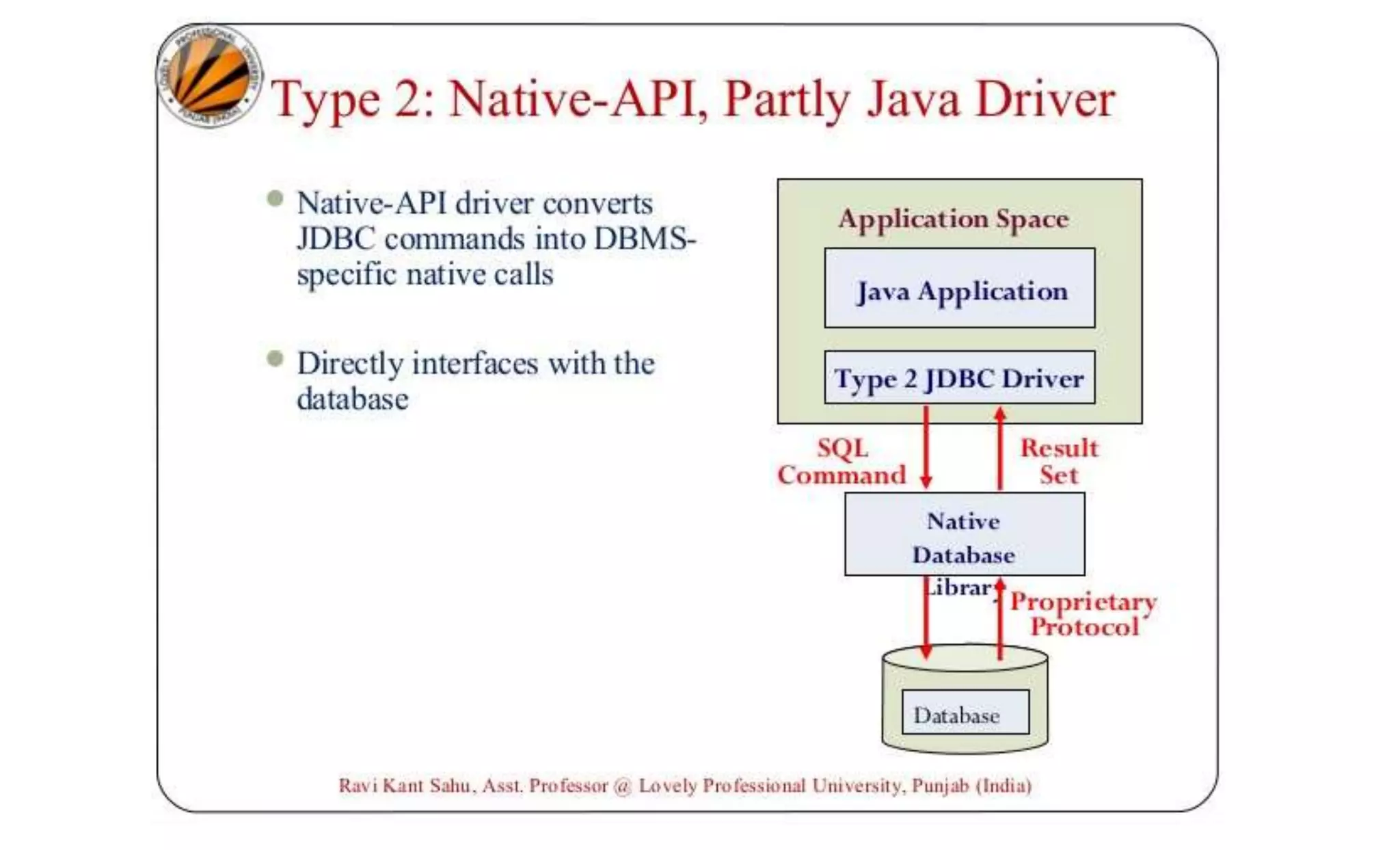 Type2: Native-API,PartlyJavaDriver • Native-APIdriver converts JDBC commands into DBMS-specific native calls • Directly interfaces with the database Application Space Java Application Type 2 JDBC Driver Database SQL Command Result Set Native Database Library Proprietary Protocol