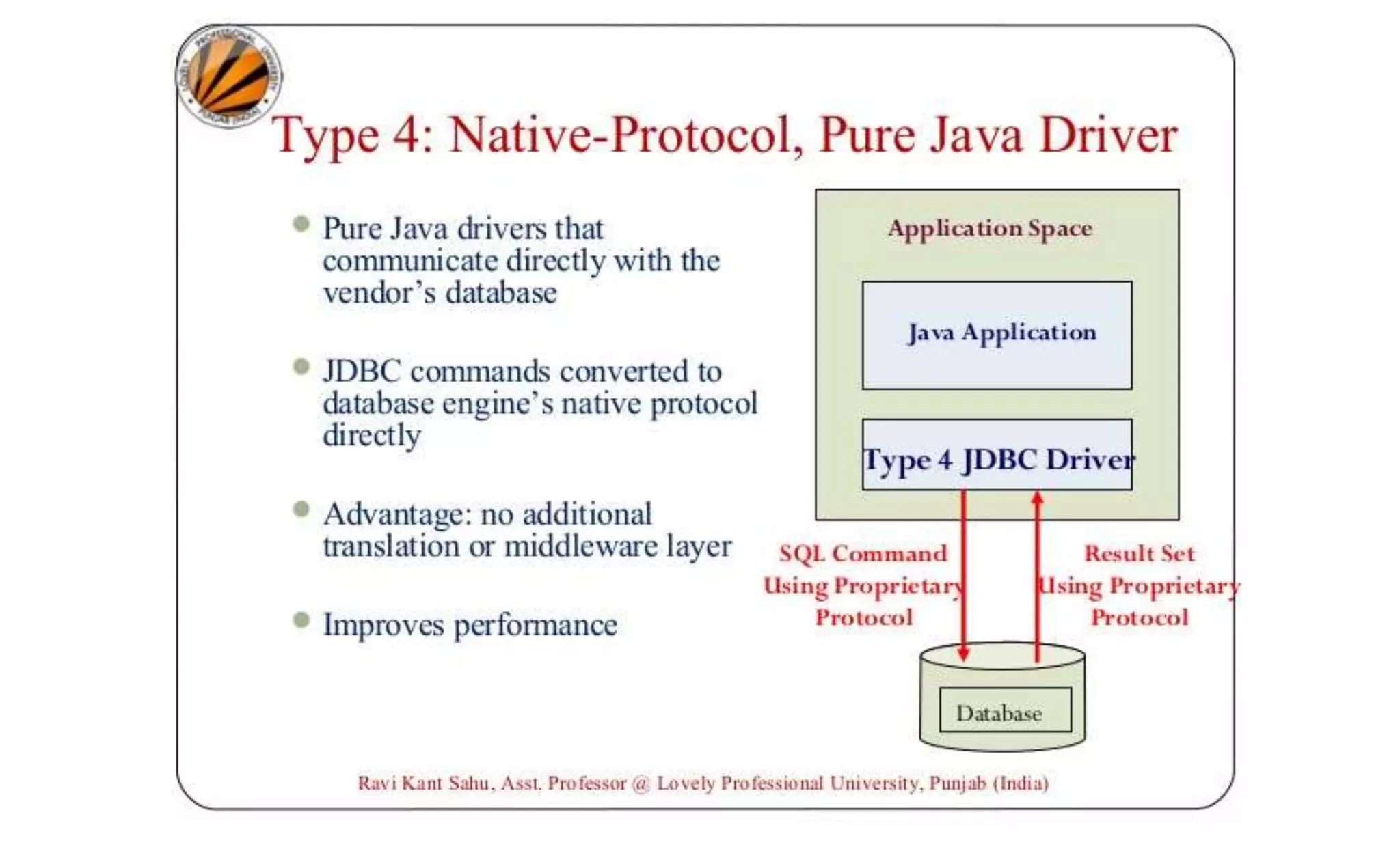 Type4: Native-Protocol,PureJavaDriver  PureJava drivers that communicate directly with the vendor’s database  JDBC commands converted to database engine’s native protocol directly  Advantage: no additional translation or middleware layer  Improves performance Application Space Java Application Type 4 JDBC Driver Database SQL Command Using Proprietary Protocol Result Set Using Proprietary Protocol