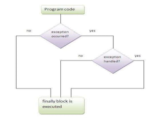 This document provides an overview of exception handling in Java. It defines what exceptions are, which are errors that disrupt normal program flow. There are three main types of exceptions: checked exceptions that must be declared, unchecked exceptions that do not need to be declared, and errors. The try-catch block is used to handle exceptions, with catch blocks specifying the exception types to handle. Finally blocks will execute regardless of whether an exception occurred or not and are used for cleanup code. Custom exceptions can also be created by extending the Exception class.