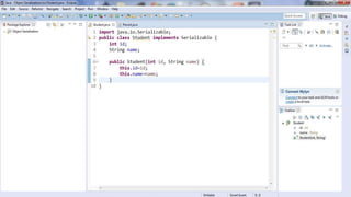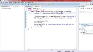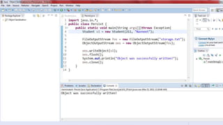 This document discusses Java I/O and serialization. It explains that streams in Java represent an abstraction for input/output and are linked to physical devices. Byte and character streams are defined using input/output stream hierarchies. Object serialization involves writing Java objects to files by converting their state to a byte series. Classes like ObjectInputStream and ObjectOutputStream are used for reading and writing objects. The transient keyword indicates a variable should not be part of an object's persisted state during serialization.