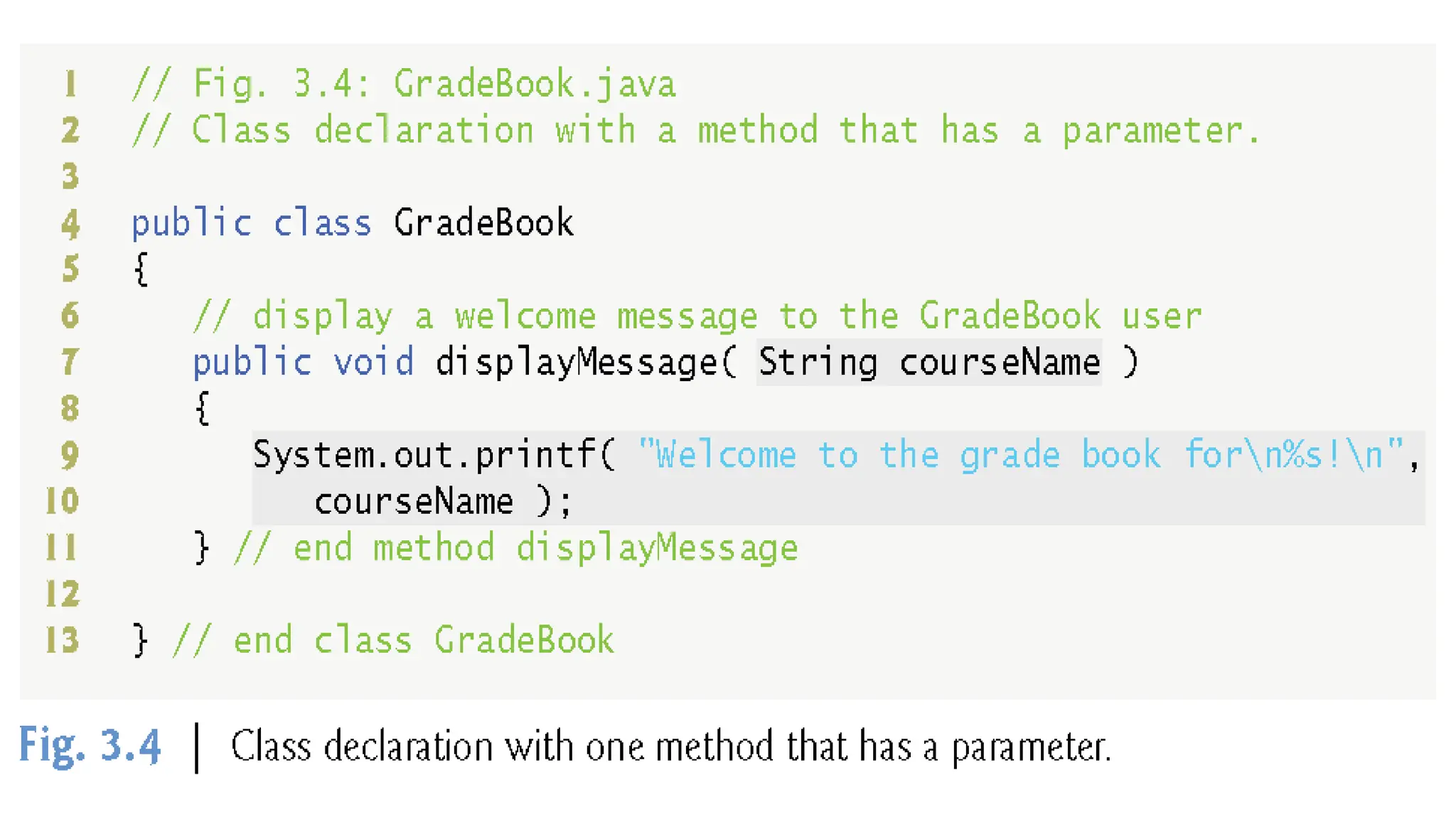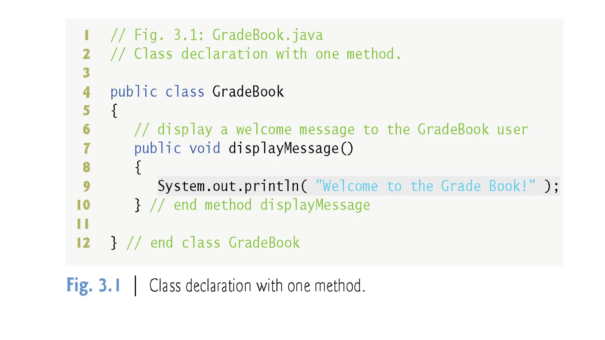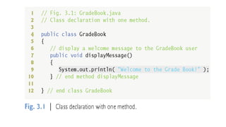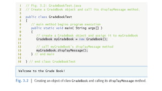 • The GradeBook class declaration (Fig. 3.1) contains a displayMessage method