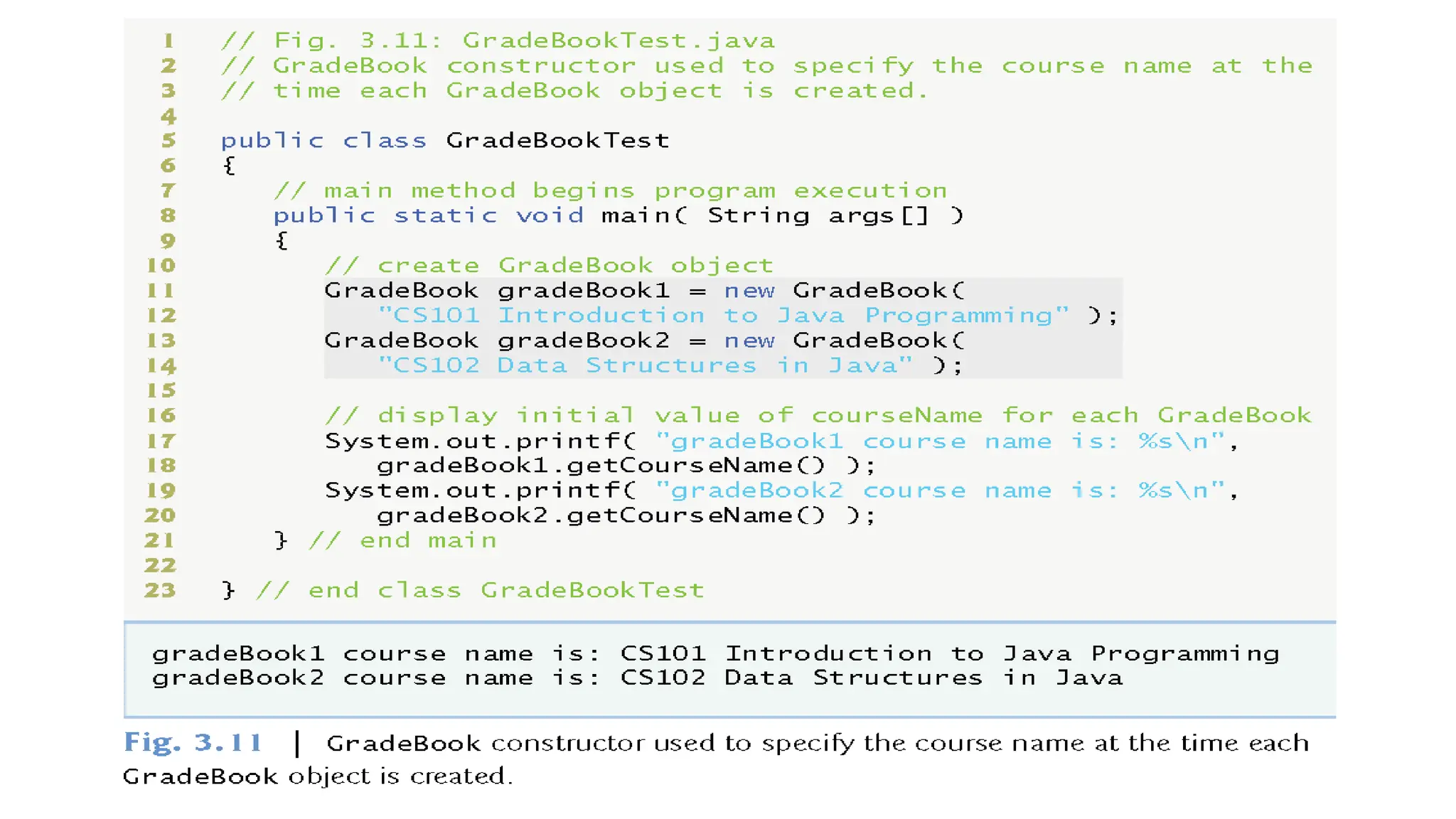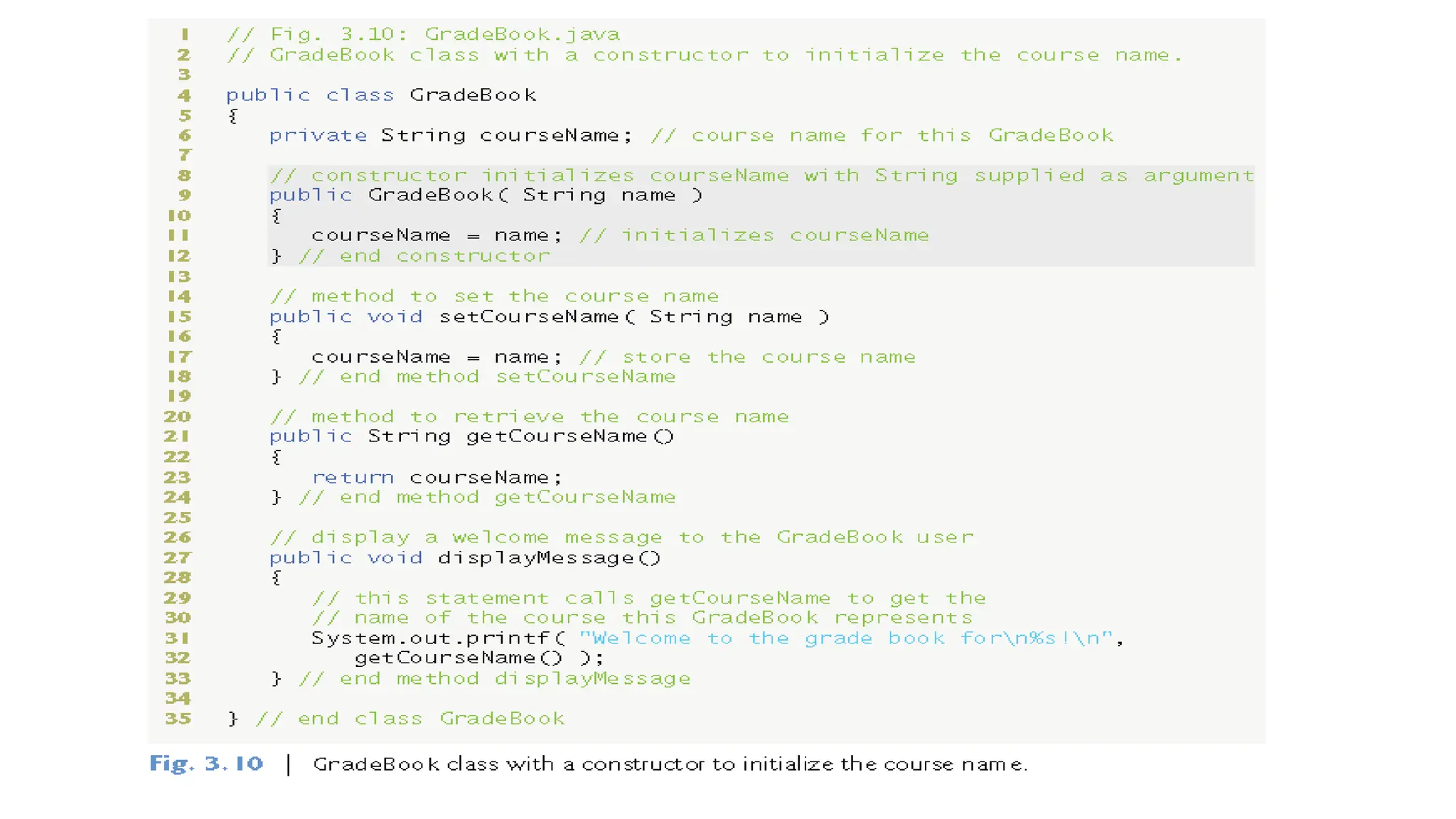 • Line 9 indicates that class GradeBook’s constructor has a String parameter called name. The