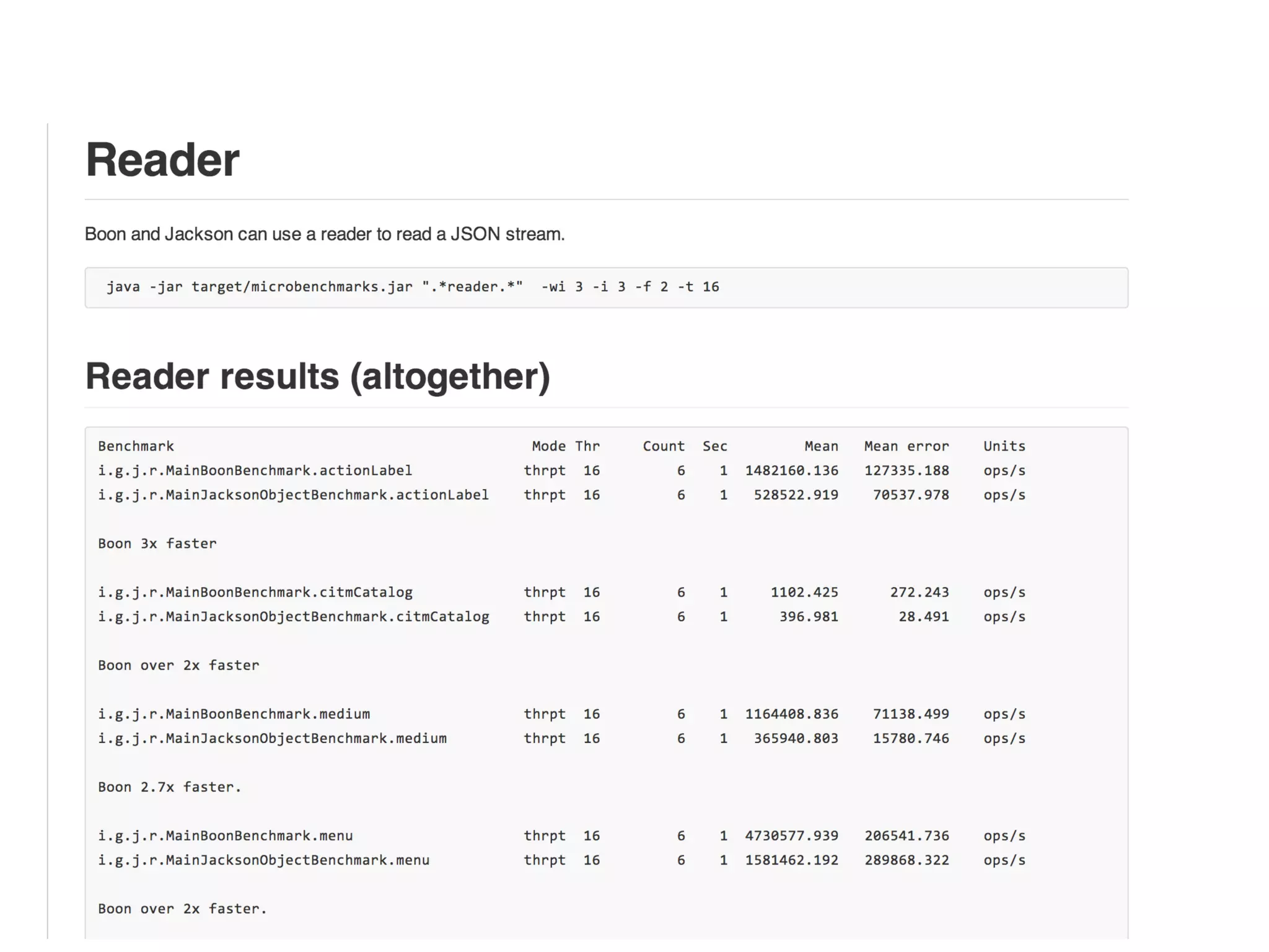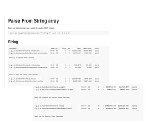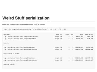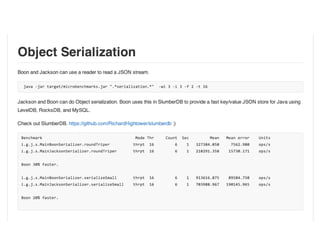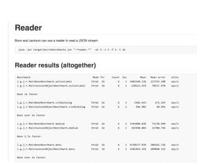 The document discusses benchmarks comparing various JSON parsers in Java, with a focus on the Boon parser, which is shown to be significantly faster than Jackson and Gson in most scenarios. It outlines the performance of Boon in reading and writing JSON, especially in reactive environments, and how it compares to Groovy's 2.3 JSON parser. Additionally, it highlights that while Jackson excels with large JSON files and has solid tooling support, Boon offers a more productive API experience for developers transitioning from other programming languages.