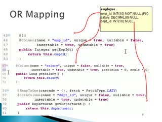 The document discusses Java Persistence API (JPA) and Hibernate. It describes JPA as the standard for object/relational mapping and persistence management. It outlines five steps to implement JPA using Hibernate: download components, prepare the database, implement POJO entities with annotations, configure persistence.xml, and write client code using EntityManager. Hibernate provides the core functionality and additional annotations and tools to implement JPA standards.