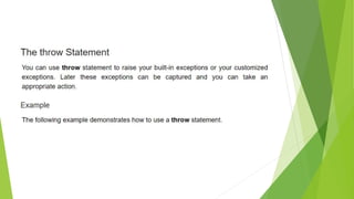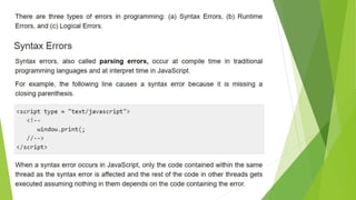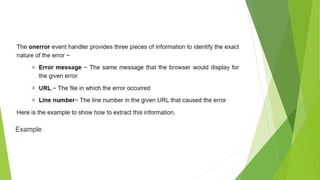 The document discusses JavaScript error and exception handling using try, catch, and finally blocks. It provides examples of using try and catch to handle exceptions, catch to retrieve error details, and finally to execute code regardless of exceptions. It also shows how to use window.onerror to handle uncaught exceptions and access error details.