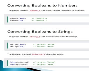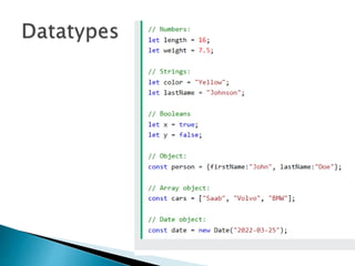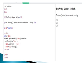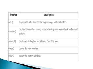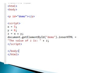 This document provides an overview of JavaScript as a client-side scripting language, highlighting its role in creating dynamic web content through interaction with HTML. It covers key concepts such as the Browser Object Model, Document Object Model (DOM), various JavaScript functions and operators, loops, and event handling. Additionally, it illustrates how to manipulate web elements using JavaScript, including examples of declaring variables and defining functions.