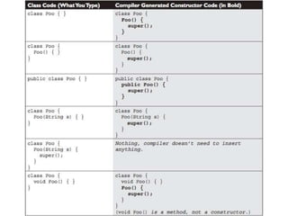 This document provides an overview of object-oriented programming concepts in Java including classes, objects, encapsulation, inheritance, polymorphism, abstraction, overriding and overloading methods, reference variable casting, constructors and instantiation. Key points covered include defining classes and objects, using access modifiers for encapsulation, inheritance relationships between classes, polymorphism through method overriding, rules for overriding methods, and how to properly create and initialize objects using constructors.