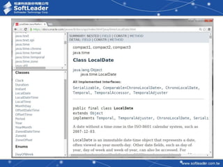 - The API separates the concepts of date, time, and timestamps (LocalDate, LocalTime, LocalDateTime) from calendar systems and timezones (ZonedDateTime).