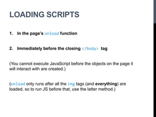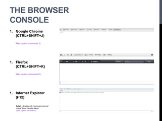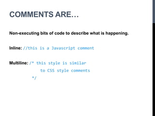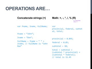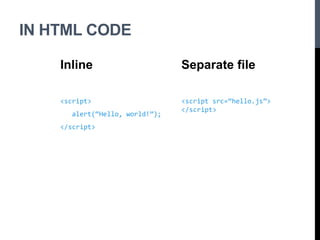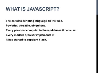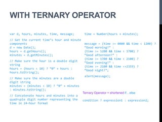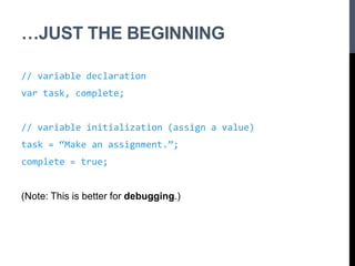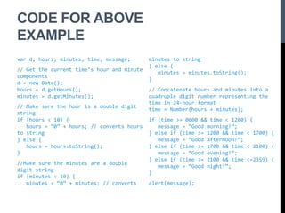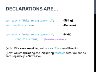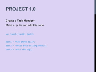 The document gives examples and explanations for JavaScript syntax and fundamentals to help newcomers get started with the language. It also outlines a simple task manager project as an introduction to building applications with JavaScript.