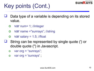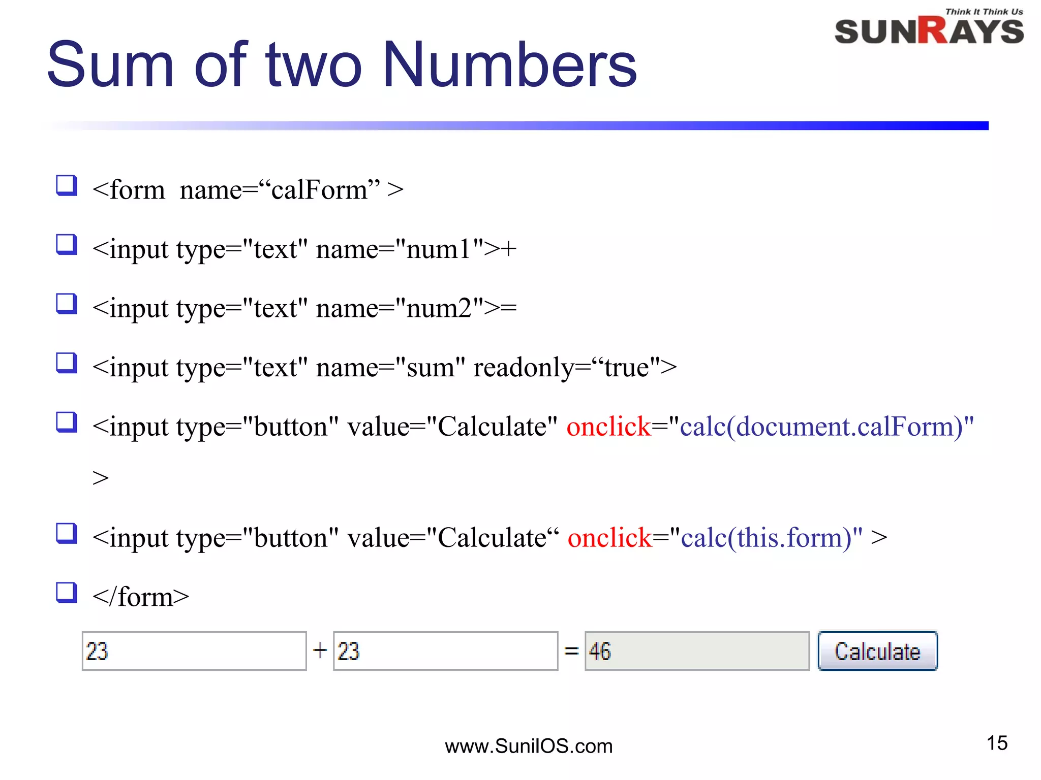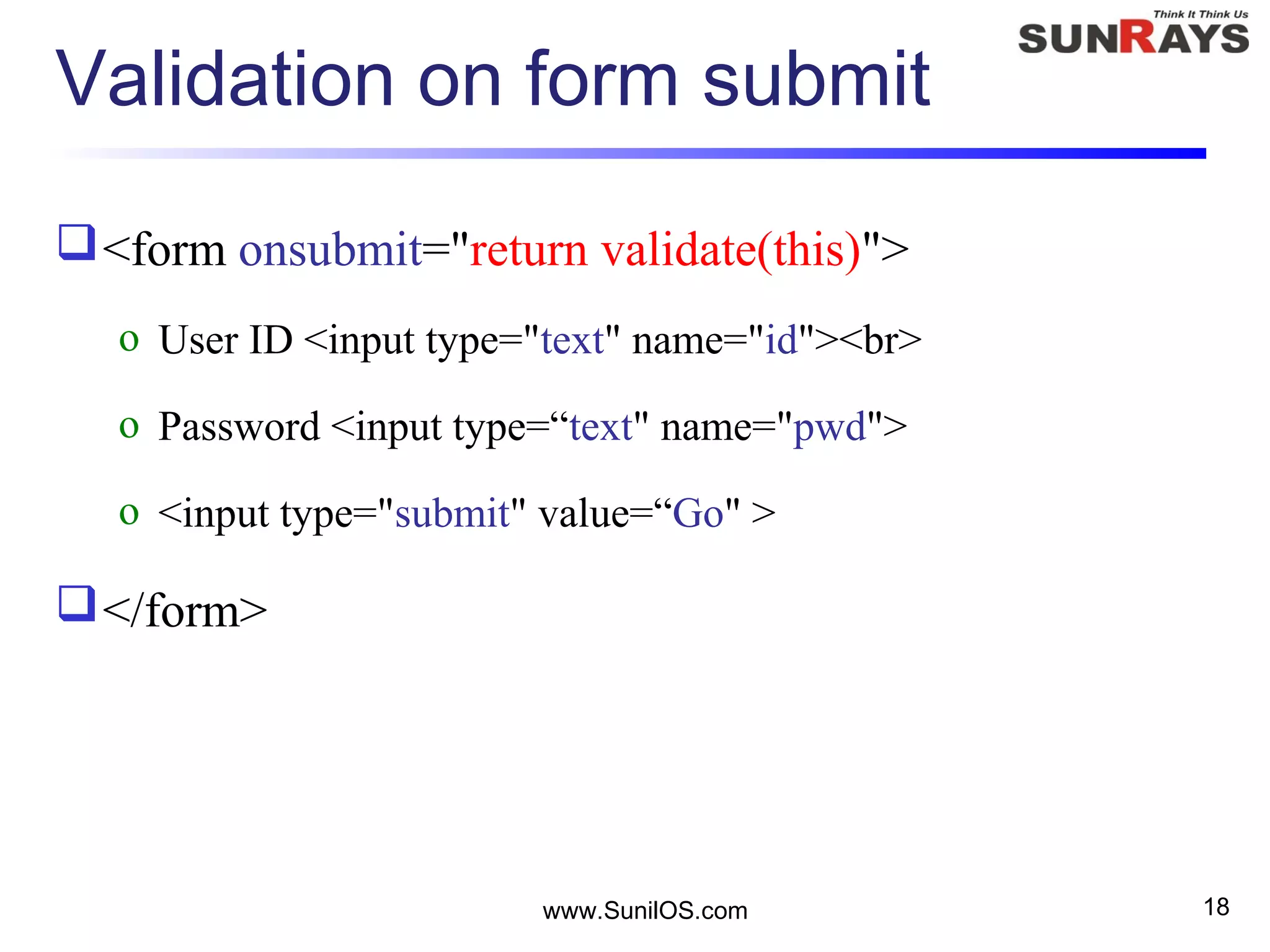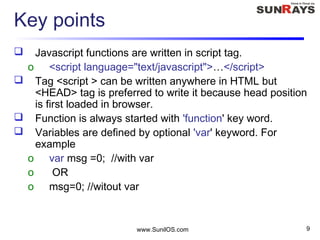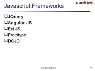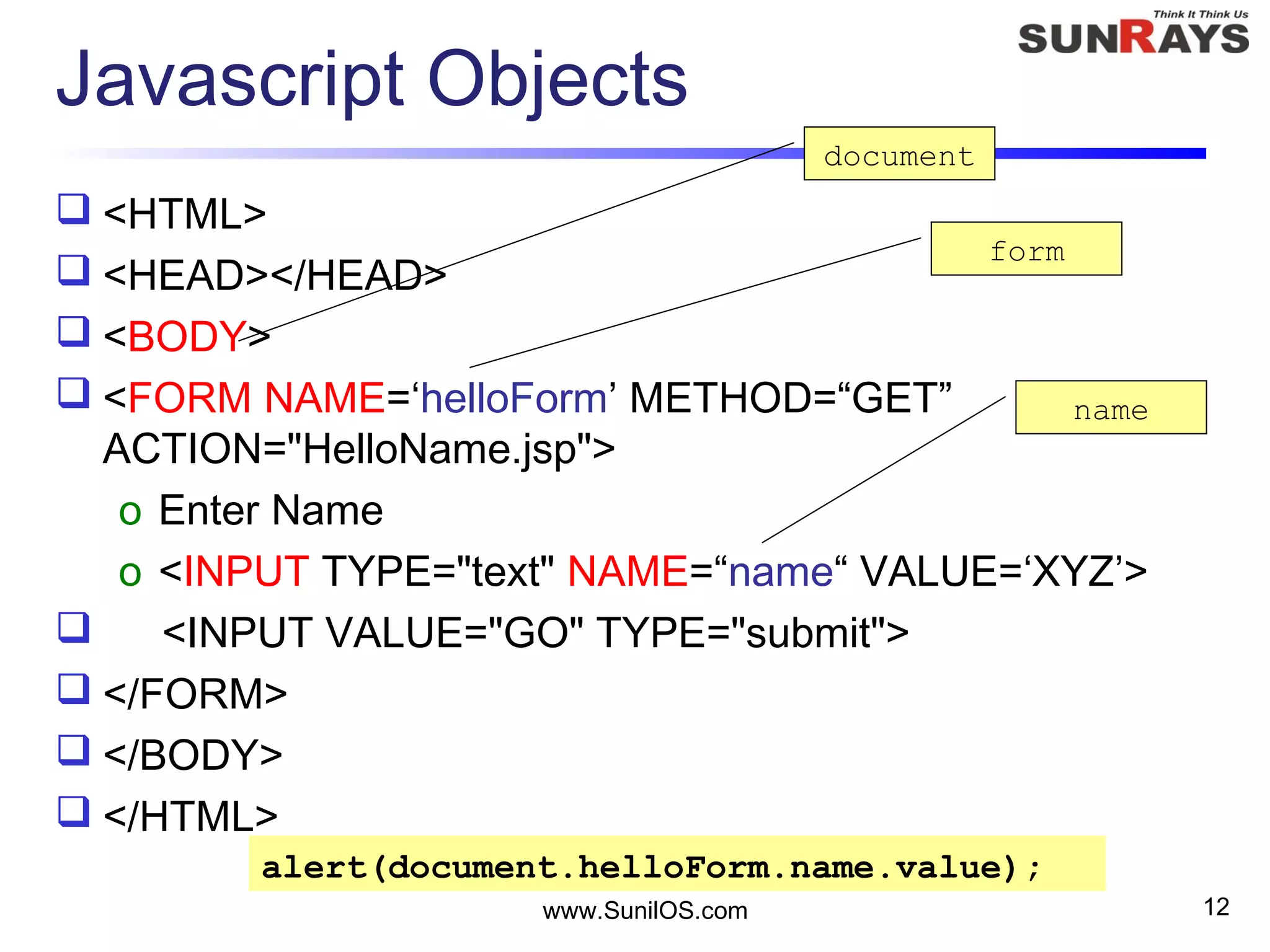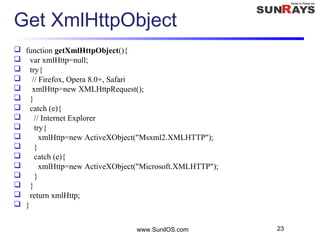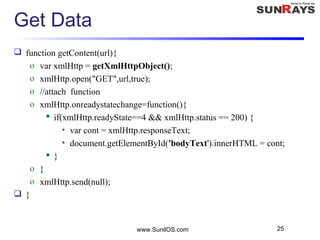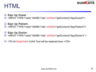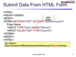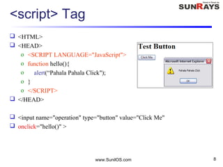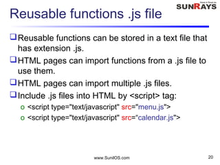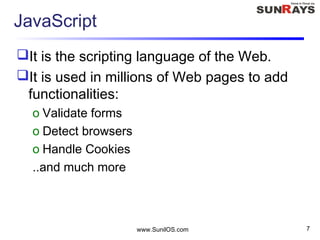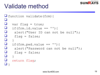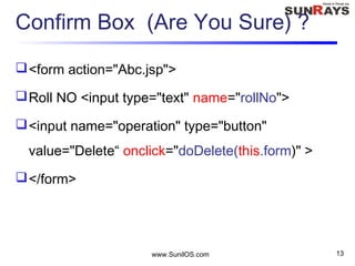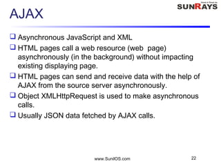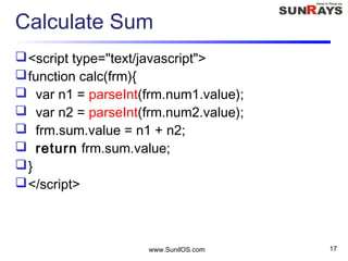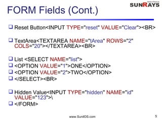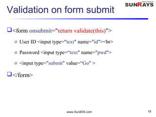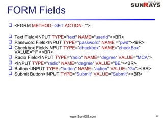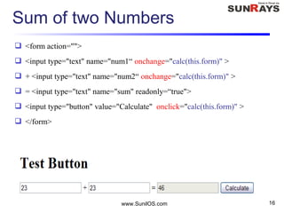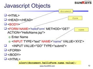 The document provides information about HTML forms and JavaScript. It includes examples of HTML form fields like text, password, checkbox, radio buttons, and submit buttons. It also discusses how JavaScript can be used to validate form data, submit forms, and perform calculations. The last part discusses AJAX and how JavaScript and XMLHttpRequest object can be used to make asynchronous calls to retrieve and display data without reloading the page.