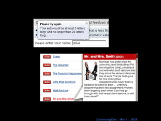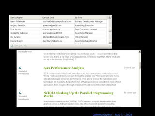 The document discusses various JavaScript DOM design patterns aimed at improving user interfaces through techniques like inline editing, composite controls, and AJAX implementations. It details how these patterns address common problems in web applications, emphasizing user experience and maintaining seamless interactions without page refreshes. The author, Dave Johnson, provides insights and practical examples of handling events, managing state, and implementing rich user interface components while addressing common pitfalls and best practices.