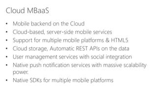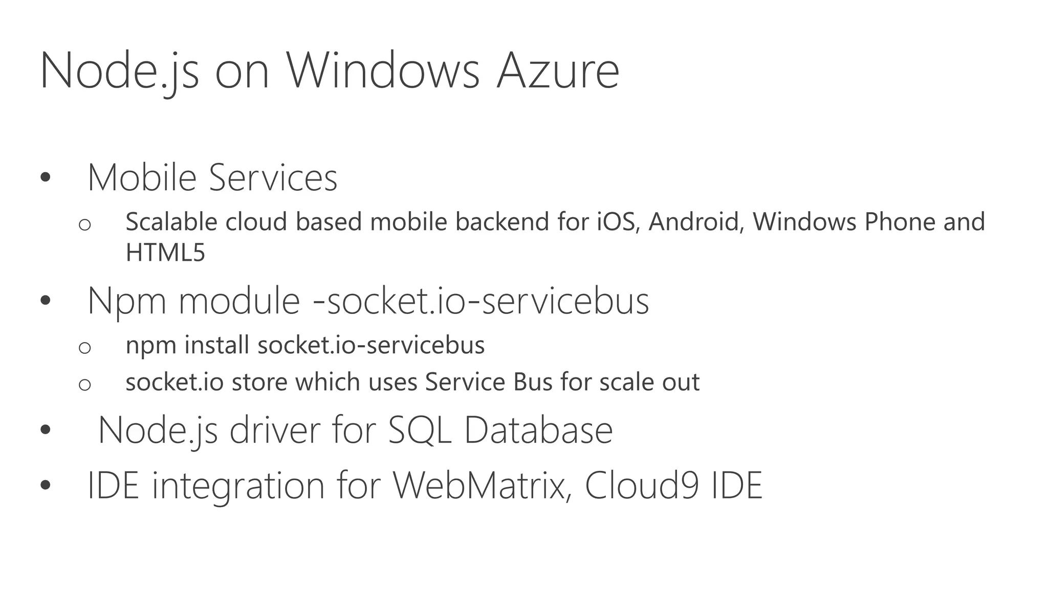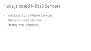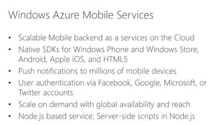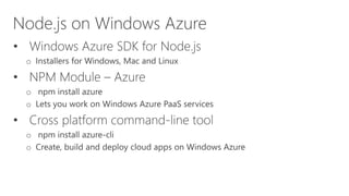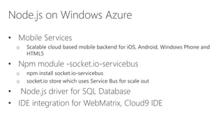 This document contains links to resources about working with Azure services and technologies in Node.js including sending push notifications, reading from Azure Storage tables, sending emails with SendGrid, using Service Bus with Socket.io, the Node.js SDK for Azure, and the Azure mobile solutions page. It also includes links to the author's GitHub and blog.