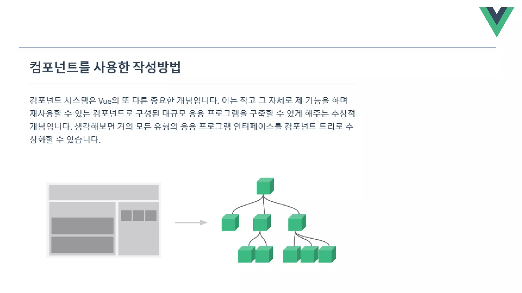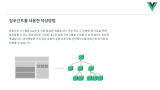 Vue에서 컴포넌트를 사용하는 방법은 매우 간단합니다. 아래 예제처럼 Vue에서, 컴포넌트를 정의합니다.