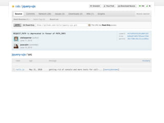 This document discusses using jQuery with Ruby on Rails. It covers including jQuery and rails.js in Rails 3 applications, reproducing CSRF meta tags, using remote links, and rendering JavaScript templates. It also discusses making AJAX requests in Rails 2 applications by returning JSON from controllers and binding to jQuery events in rails.js. The document provides an introduction and agenda for a presentation on integrating jQuery into Ruby on Rails applications.