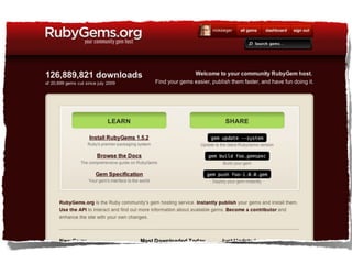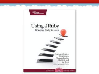 This document summarizes a presentation on using JRuby and Ruby on Rails for web application development. It discusses how JRuby allows Ruby code to drive Java, embed Ruby in Java applications, and compile Ruby to Java bytecode. Rails is presented as a dynamic web framework that uses conventions over configuration and opinionated defaults. The document provides examples of common Rails features like scaffolding, models, controllers and views. It also outlines how to deploy Rails applications as WAR files or to cloud platforms using JRuby.