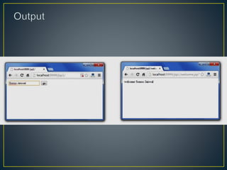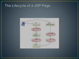 Java Server Pages (JSP) is a technology for creating dynamic web applications using Java, allowing for easier maintenance compared to servlets by separating design and code. JSP pages combine HTML and Java code, utilizing various tags for scripting, directives, and actions, with session management and request handling capabilities. The document also outlines the structure of JSP pages, including various types of directives, scripting elements, and session tracking mechanisms.