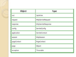 Java Server Page (JSP) is a technology that helps create web applications similarly to servlets. JSP pages contain HTML code and JSP tags, making them easier to maintain than servlets by separating design from development. JSP provides additional features like expression language and custom tags. JSP is an extension of servlets and allows using implicit objects, predefined tags, and expression language to simplify development compared to servlets. A JSP page is translated to a servlet by the JSP translator, then compiled and executed similarly to servlets through initialization, request processing, and destruction.