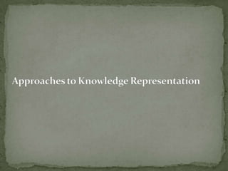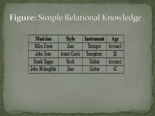 The document discusses different types of knowledge that may need to be represented in AI systems, including objects, events, performance, and meta-knowledge. It also discusses representing knowledge at two levels: the knowledge level containing facts, and the symbol level containing representations of objects defined in terms of symbols. Common ways of representing knowledge mentioned include using English, logic, relations, semantic networks, frames, and rules. The document also discusses using knowledge for applications like learning, reasoning, and different approaches to machine learning such as skill refinement, knowledge acquisition, taking advice, problem solving, induction, discovery, and analogy.