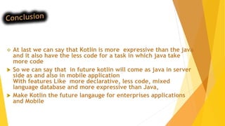 The document discusses a seminar on Kotlin, highlighting its features, history, and comparisons with Java. Kotlin is a statically-typed programming language aimed at JVM targets, known for its null safety, full Java interoperability, and ability to compile to JavaScript. The presentation also covers basic syntax and differences between Kotlin and Java, emphasizing Kotlin's advantages in reducing code complexity.