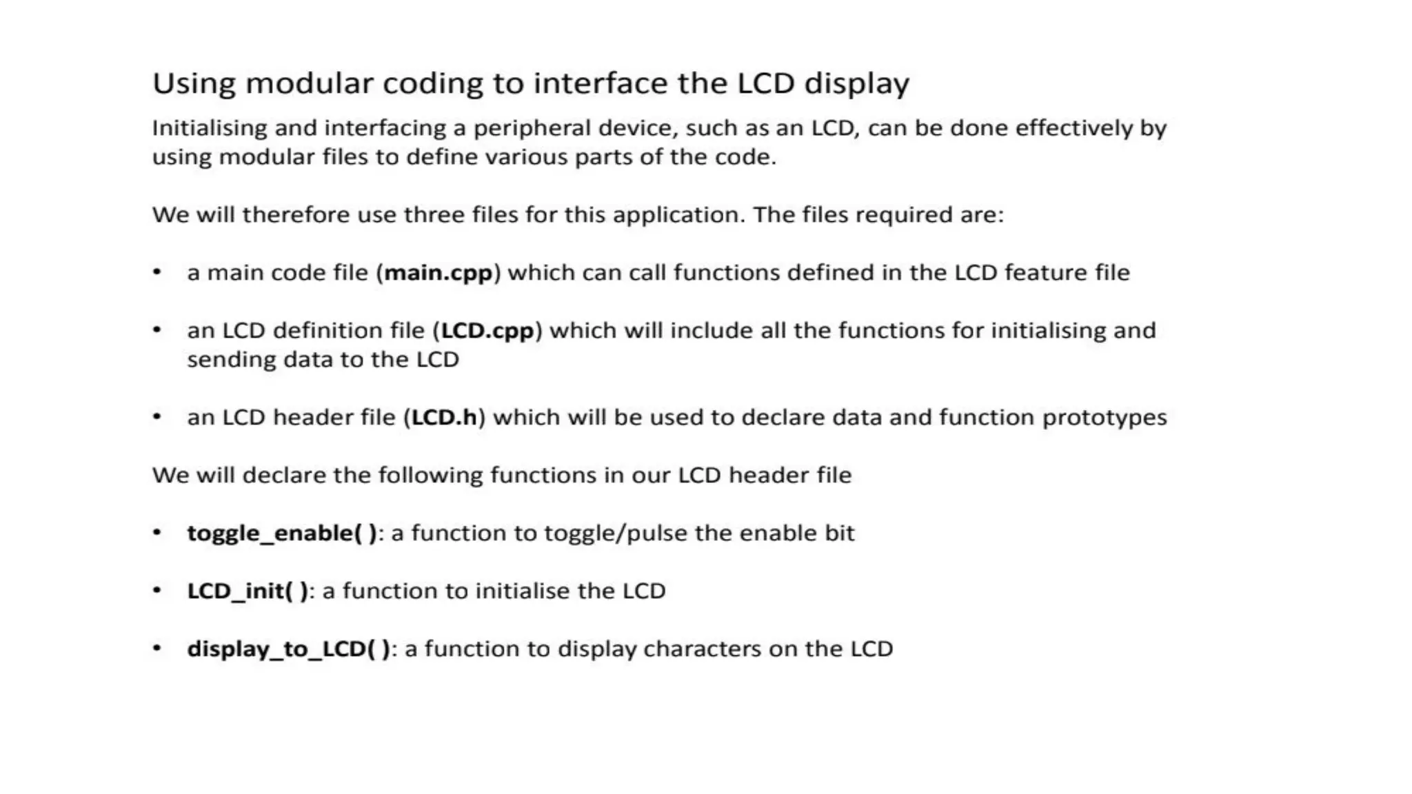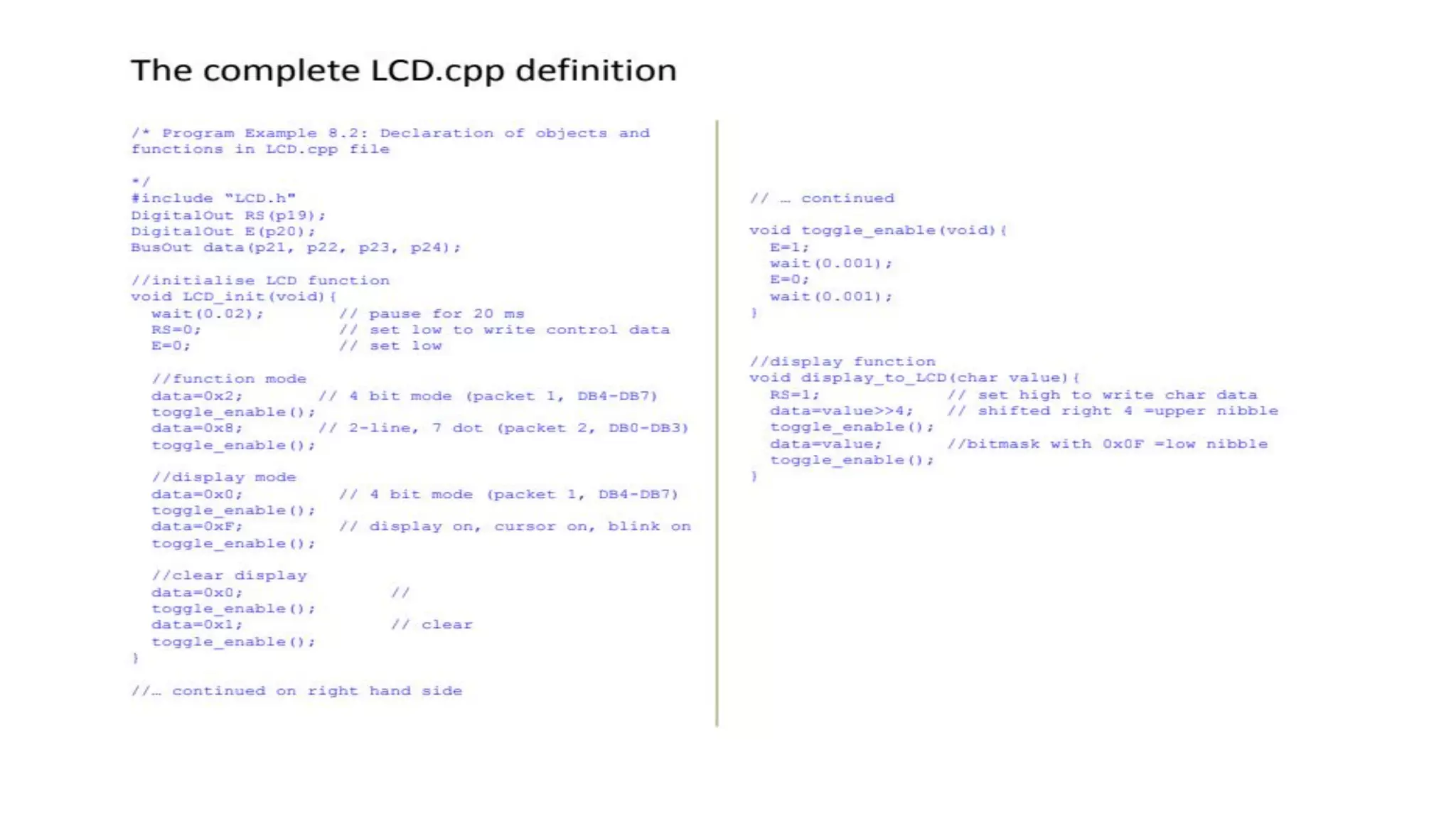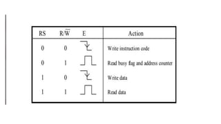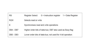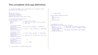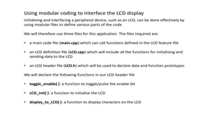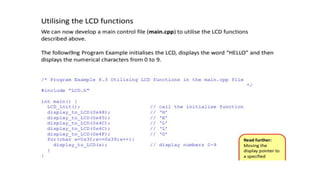 This document discusses interfacing an LCD display with an Mbed microcontroller. It includes code examples to initialize the LCD display and send display data using both a modular coding approach and the Mbed TextLCD library. The initialization process involves sending configuration commands to set up the function mode, display mode, and clear the display. Examples are provided to print "Hello World" and increment a counter value on the LCD.