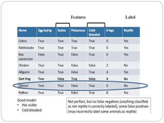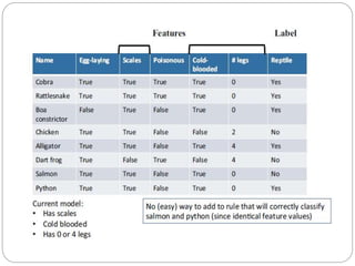 Machine learning allows computers to learn without explicit programming by analyzing data to recognize patterns and make predictions. It can be supervised, learning from labeled examples to classify new data, or unsupervised, discovering hidden patterns in unlabeled data through clustering. Key aspects include feature representation, distance metrics to compare examples, and evaluation methods like measuring error on test data to avoid overfitting to the training data.