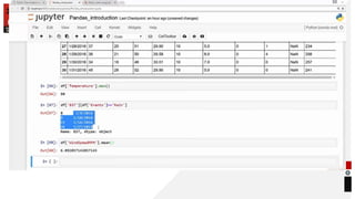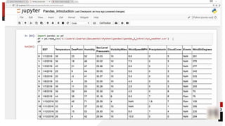 This document provides an overview of a machine learning course that teaches Pandas basics. The course aims to teach students how to handle and visualize data, apply basic learning algorithms, develop supervised and unsupervised learning techniques, and build machine learning models. The document outlines the course objectives, outcomes, syllabus including data preprocessing, feature extraction, and data visualization techniques. It also provides references for further reading.