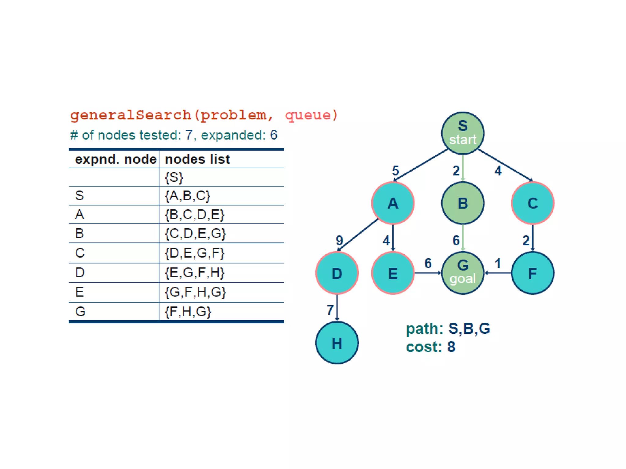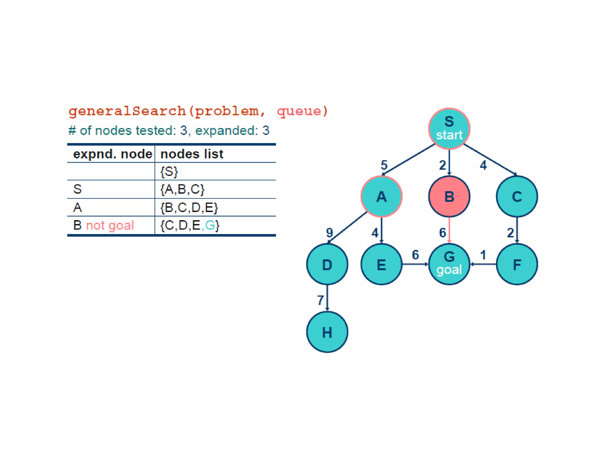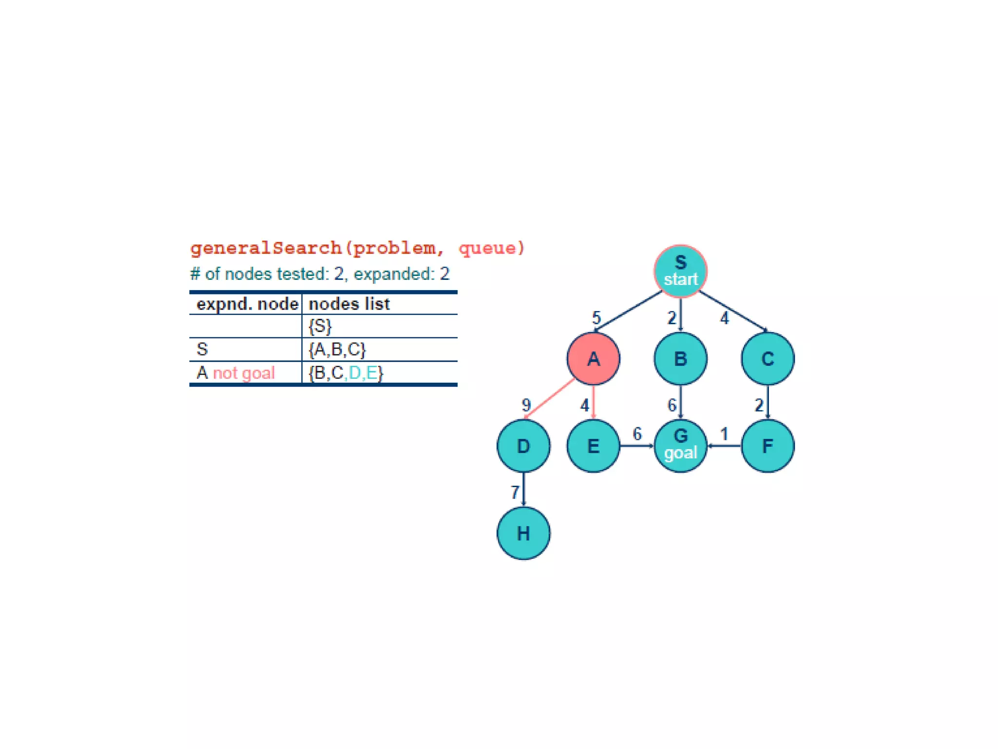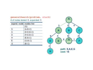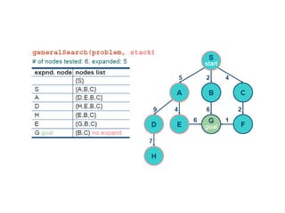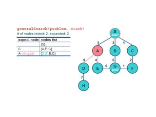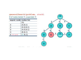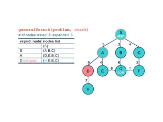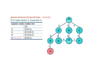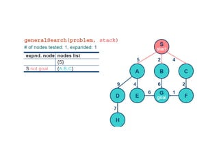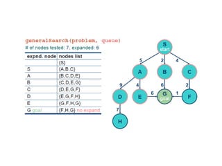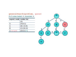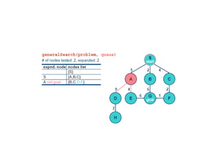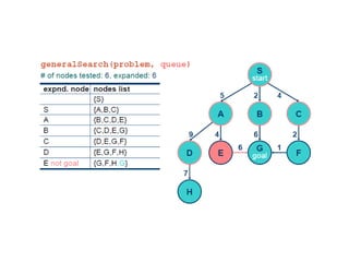 Implementation of searchalgorithms Function General-Search(problem, Queuing-Fn) returns a solution, or failure nodes  make-queue(make-node(initial-state[problem])) loop do if node is empty then return failure node  Remove-Front(nodes) if Goal-Test[problem] applied to State(node) succeeds then return node nodes  Queuing-Fn(nodes, Expand(node, Operators[problem])) end Queuing-Fn( queue , elements ) is a queuing function that inserts a set of elements into the queue and determines the order of node expansion . Varieties of the queuing function produce varieties of the search algorithm.