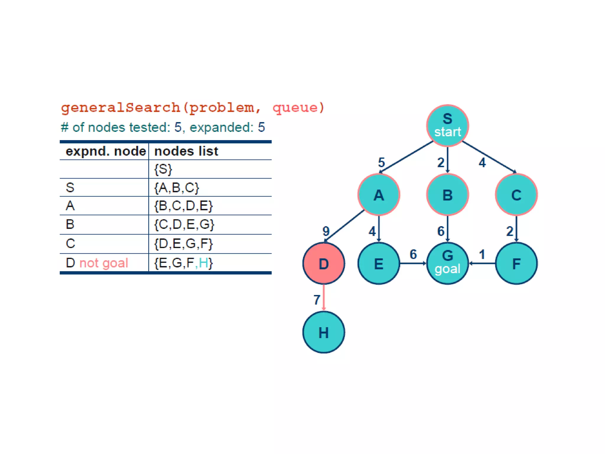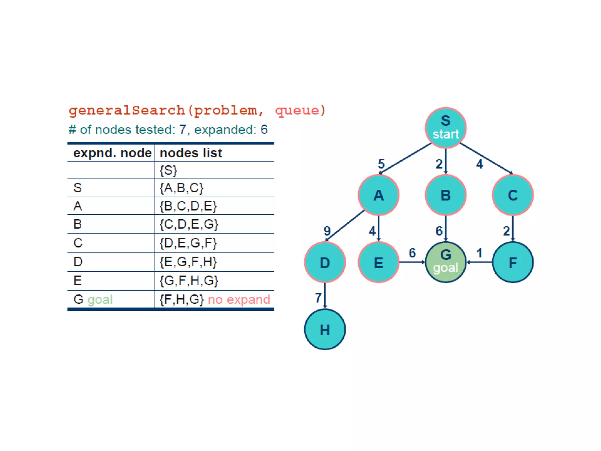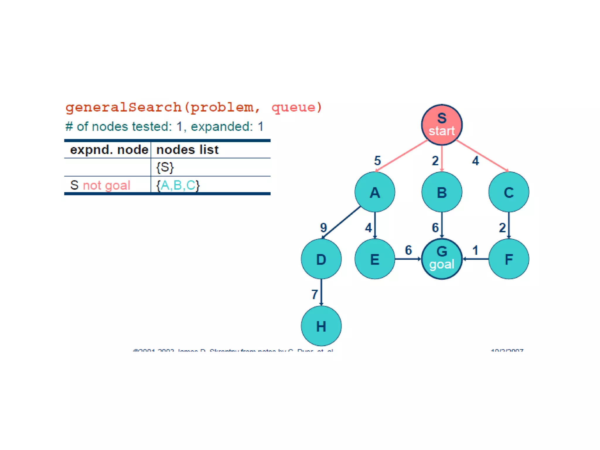 Implementation of searchalgorithms Function General-Search(problem, Queuing-Fn) returns a solution, or failure nodes  make-queue(make-node(initial-state[problem])) loop do if node is empty then return failure node  Remove-Front(nodes) if Goal-Test[problem] applied to State(node) succeeds then return node nodes  Queuing-Fn(nodes, Expand(node, Operators[problem])) end Queuing-Fn( queue , elements ) is a queuing function that inserts a set of elements into the queue and determines the order of node expansion . Varieties of the queuing function produce varieties of the search algorithm.