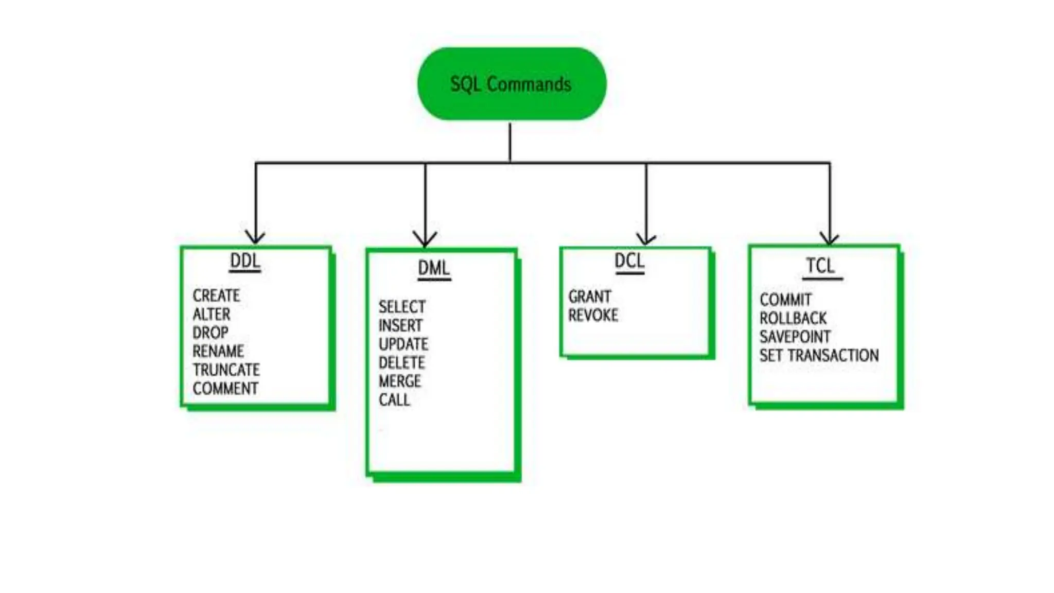The document provides an overview of SQL commands categorized into DDL, DML, DCL, and TCL, with detailed examples and explanations of each type. It covers relational database fundamentals, including table structures and common operations such as creating, deleting, and updating tables and data. Additionally, it emphasizes the importance of careful command execution, particularly for commands that permanently affect data and schema.