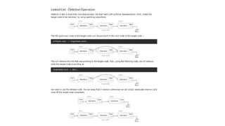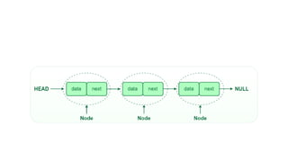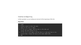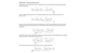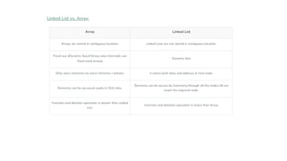 The document provides an overview of linked lists as a data structure, comparing them to arrays and outlining their advantages, such as dynamic memory allocation and ease of insertion and deletion. It describes the different types of linked lists, including singly linked, doubly linked, and circular linked lists, as well as basic operations like insertion, deletion, and searching. Additionally, the document discusses the advantages and disadvantages of linked lists and their applications in various data structures.