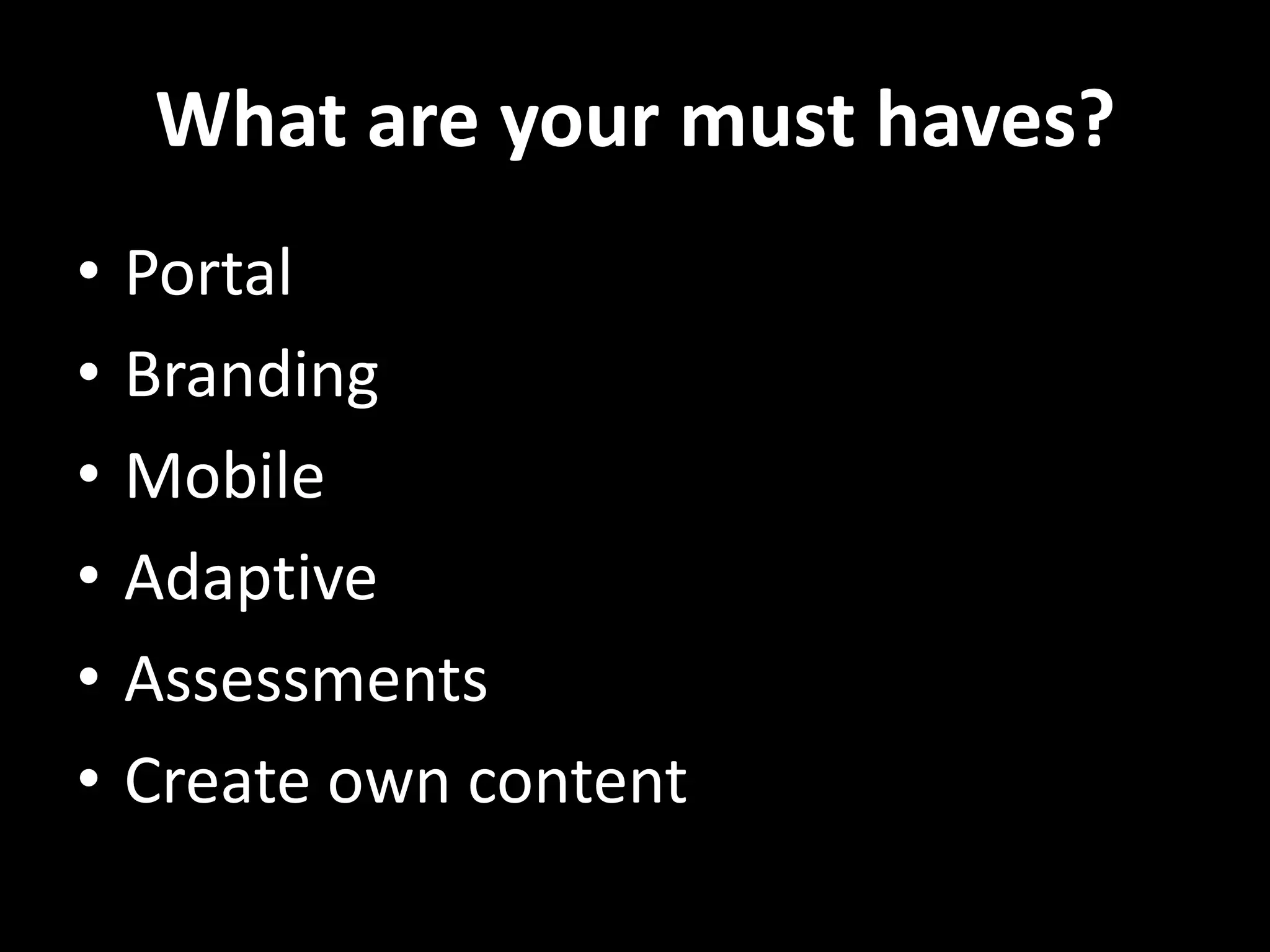 This document discusses learning management systems (LMS) and learning content management systems (LCMS). It provides definitions of LMS and LCMS, lists popular LMS providers, and outlines the process for deciding on an LMS, including talking to stakeholders, conducting research, preparing a request for proposal, testing systems, and common mistakes to avoid when purchasing an LMS.