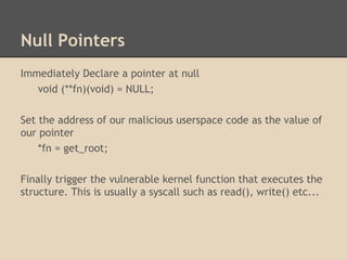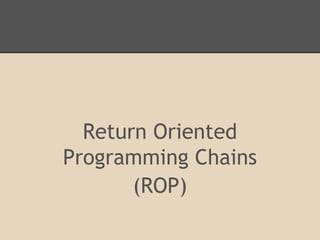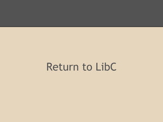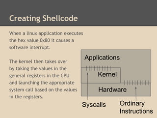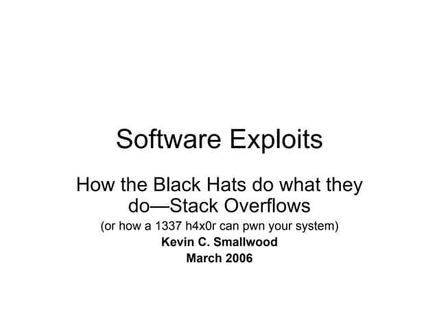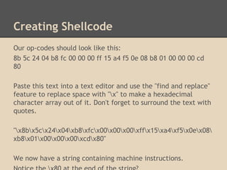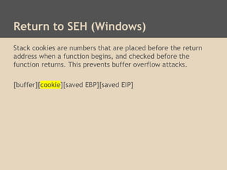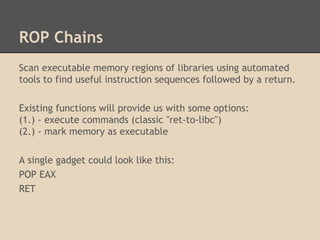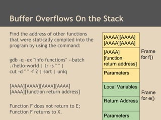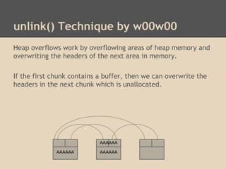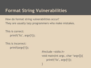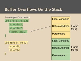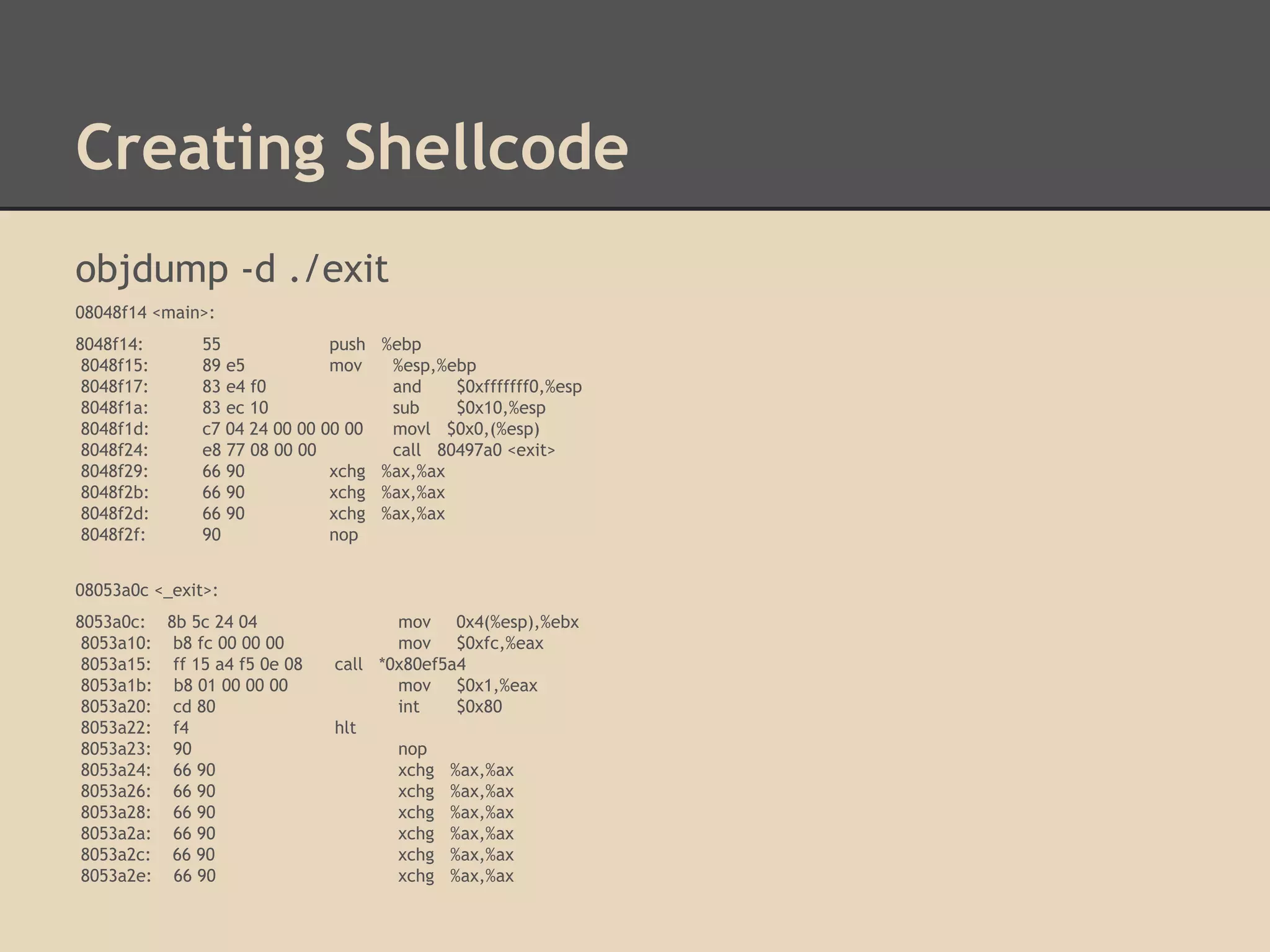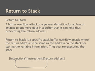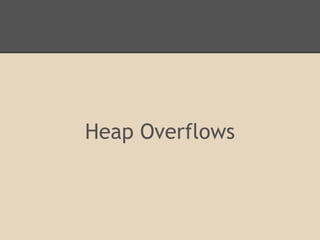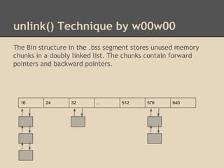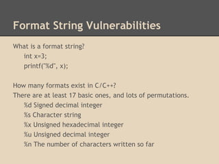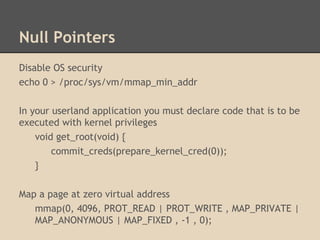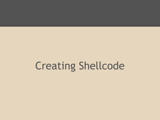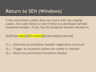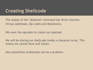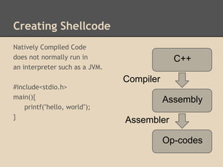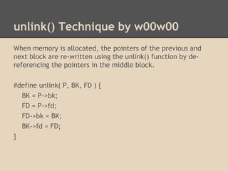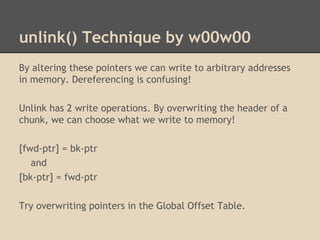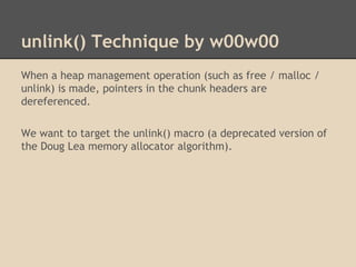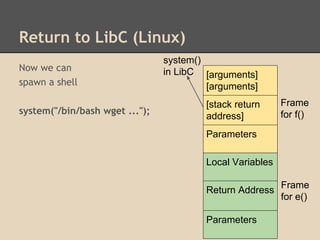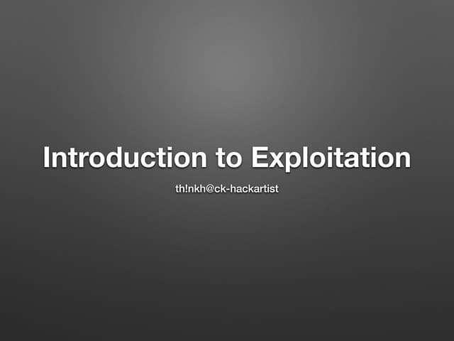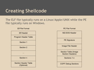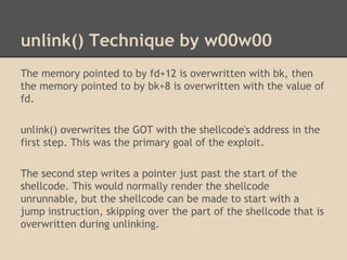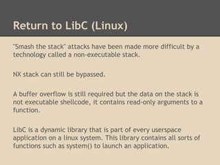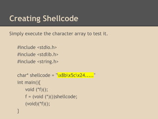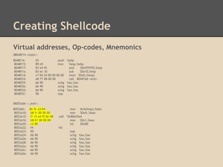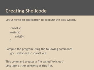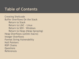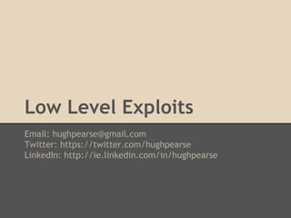 This document discusses various low-level exploits, beginning with creating shellcode by extracting opcodes from a compiled C program. It then covers stack-based buffer overflows, including return-to-stack exploits and return-to-libc. Next it discusses heap overflows using the unlink technique, integer overflows, and format string vulnerabilities. The document provides code examples and explanations of the techniques.