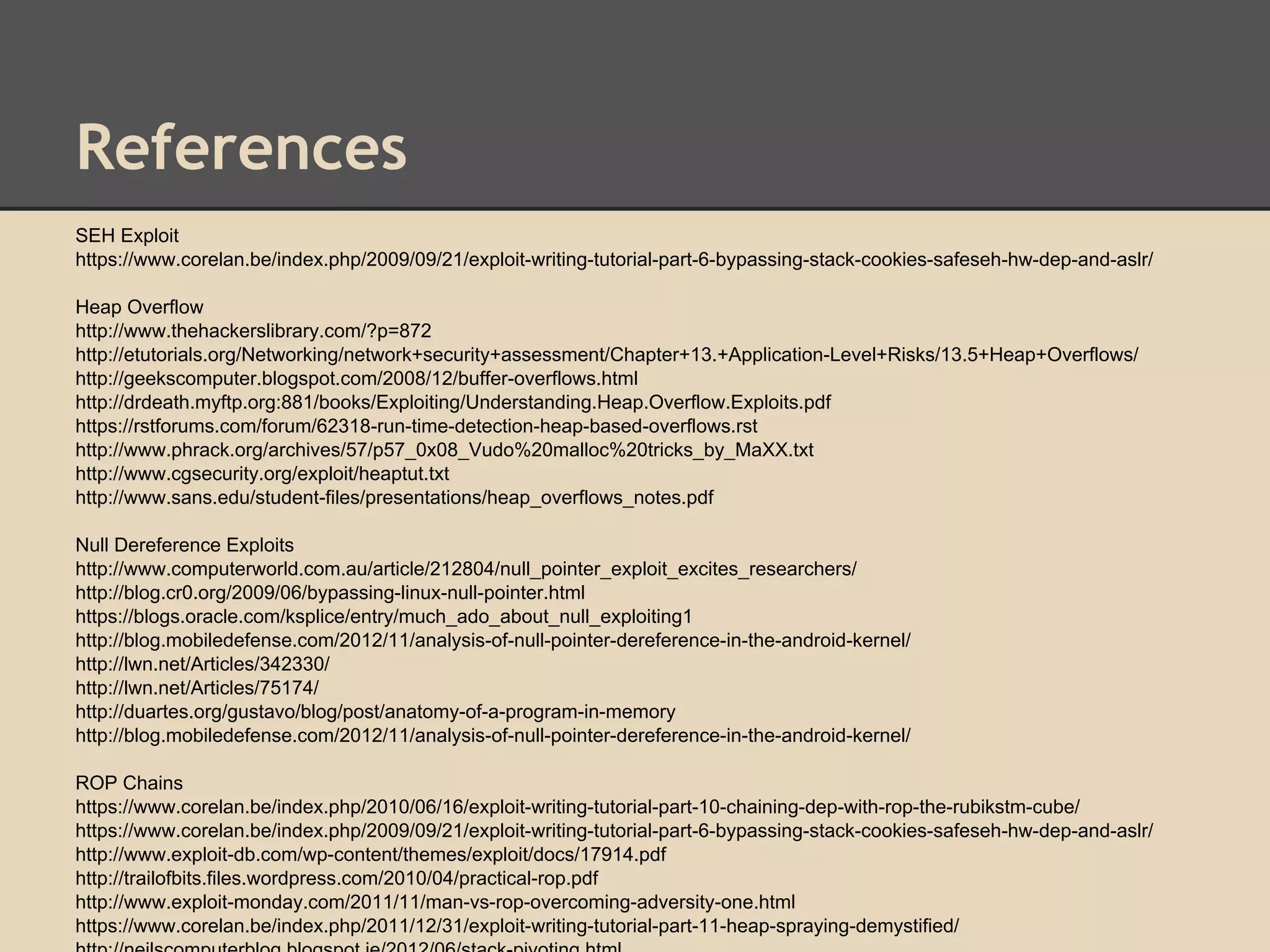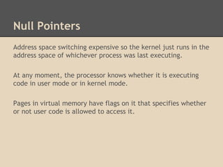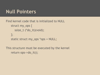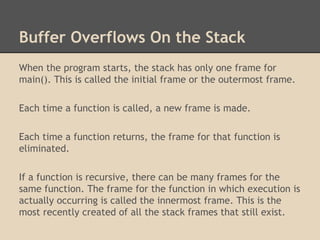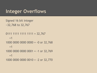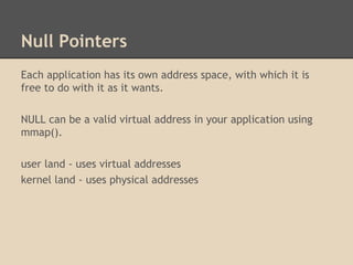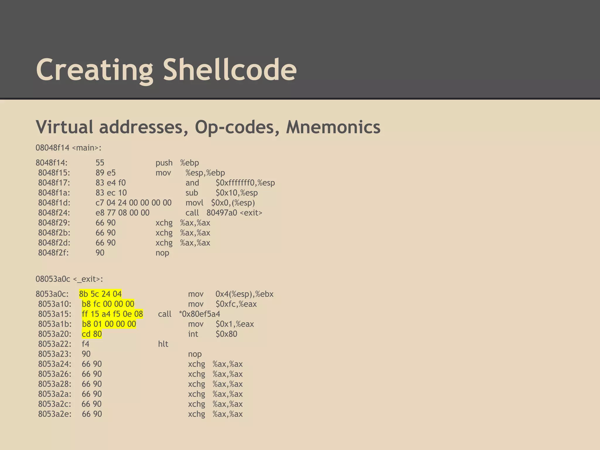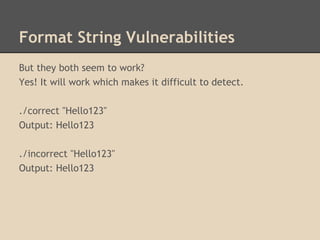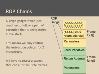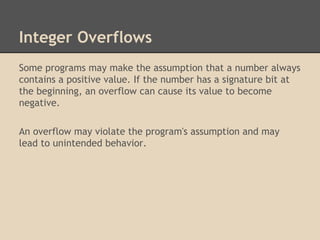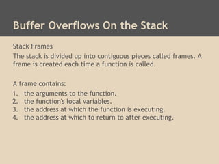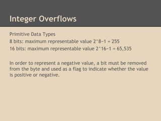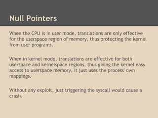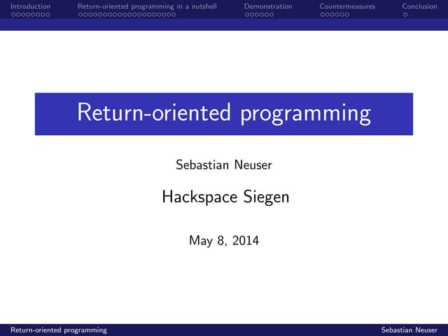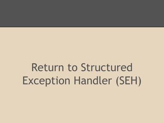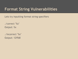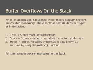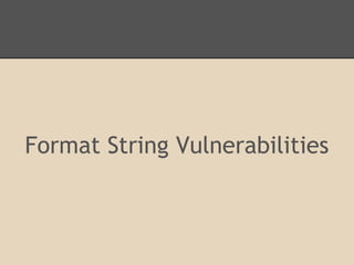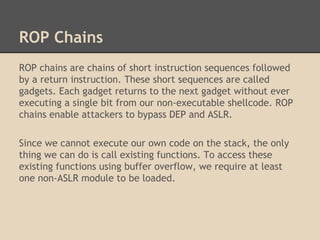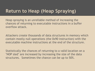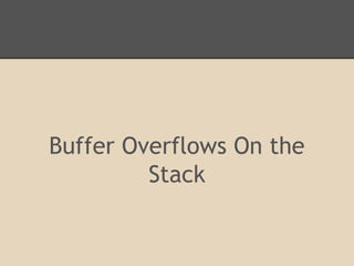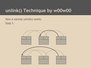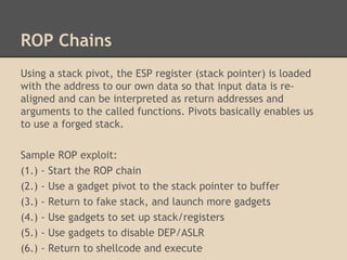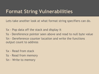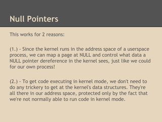 This document discusses various low-level exploits, beginning with creating shellcode by extracting opcodes from a compiled C program. It then covers stack-based buffer overflows, including return-to-stack exploits and return-to-libc. Next it discusses heap overflows using the unlink technique, integer overflows, and format string vulnerabilities. The document provides code examples and explanations of the techniques.