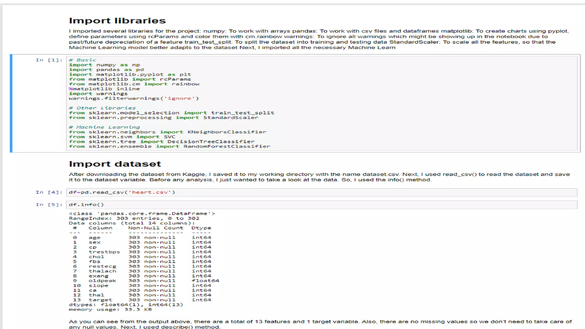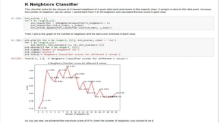 This document discusses machine learning and provides examples of common machine learning algorithms. It begins with definitions of machine learning and the machine learning process. It then describes four main types of machine learning: supervised learning, unsupervised learning, reinforcement learning, and discusses five common algorithms - K-nearest neighbors, linear regression, decision trees, naive Bayes, and support vector machines. It concludes with an overview of a heart disease prediction mini-project using Python.