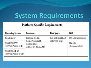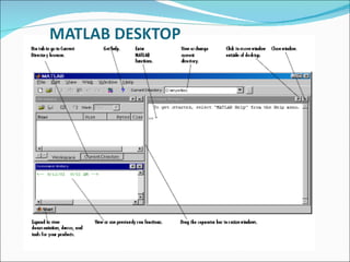 1. MATLAB is a software package for mathematical computation, numerical computation, algorithm development, data analysis, and more. It allows matrix manipulations, plotting of functions and data, implementation of algorithms, creation of user interfaces, and interfacing with programs in other languages.