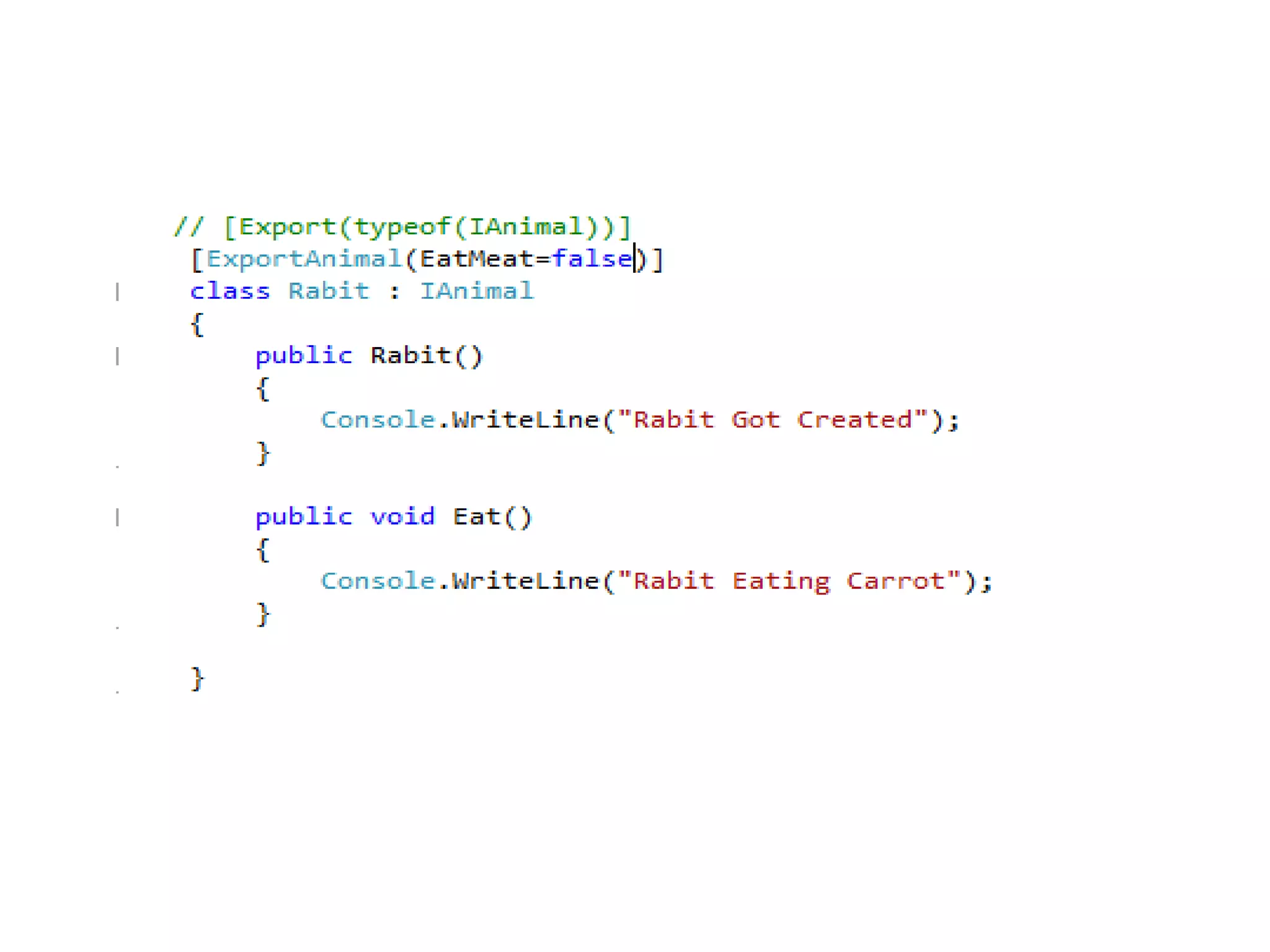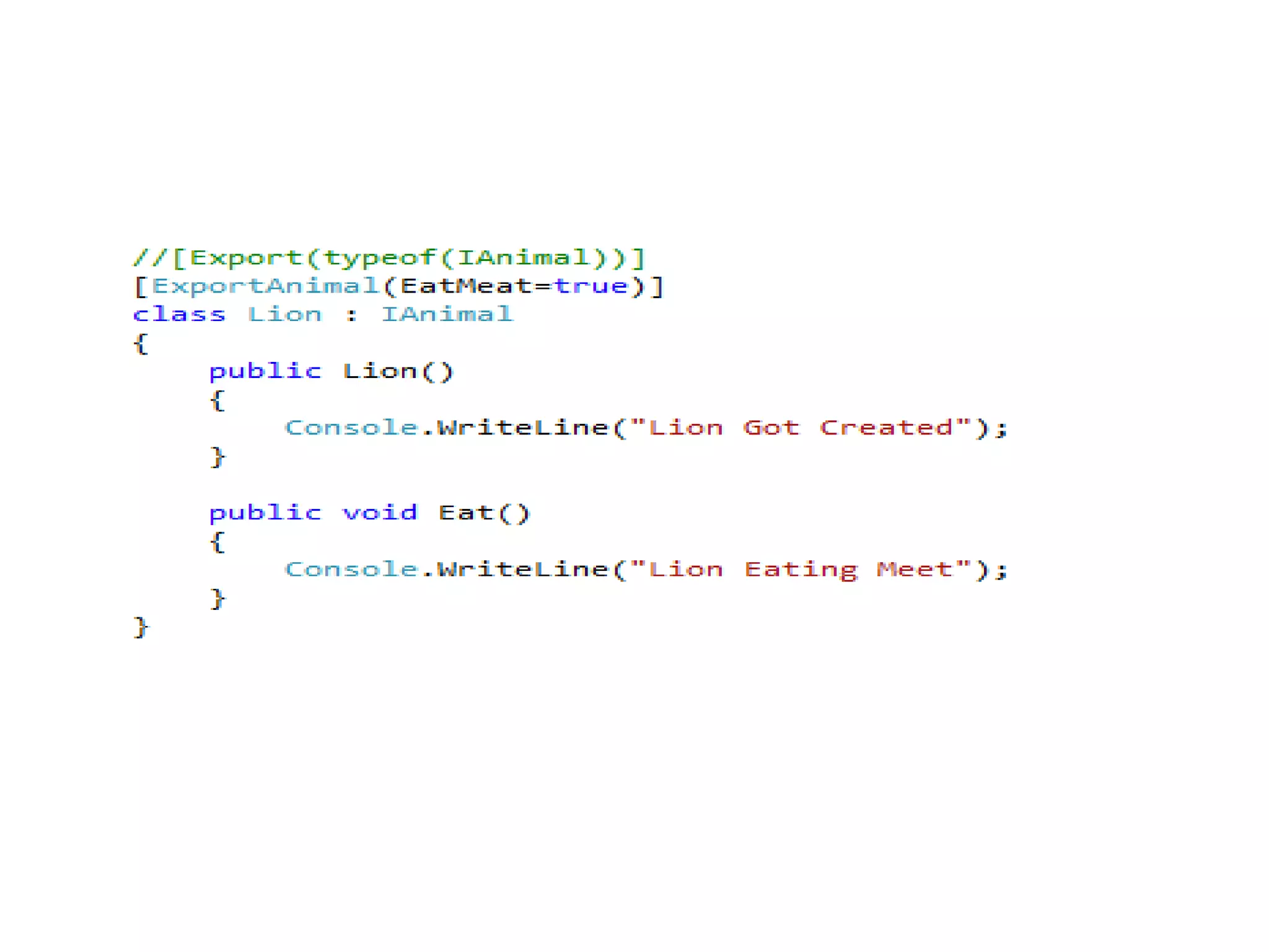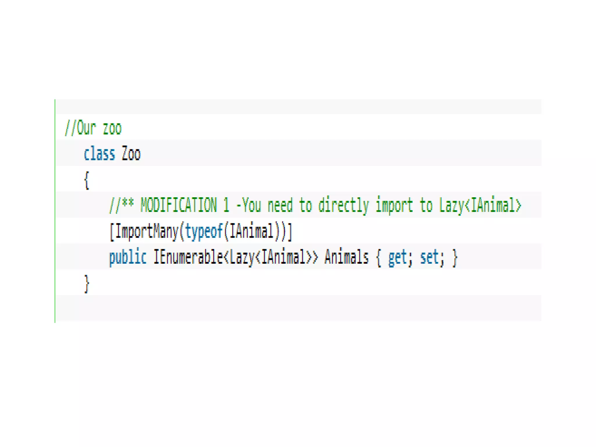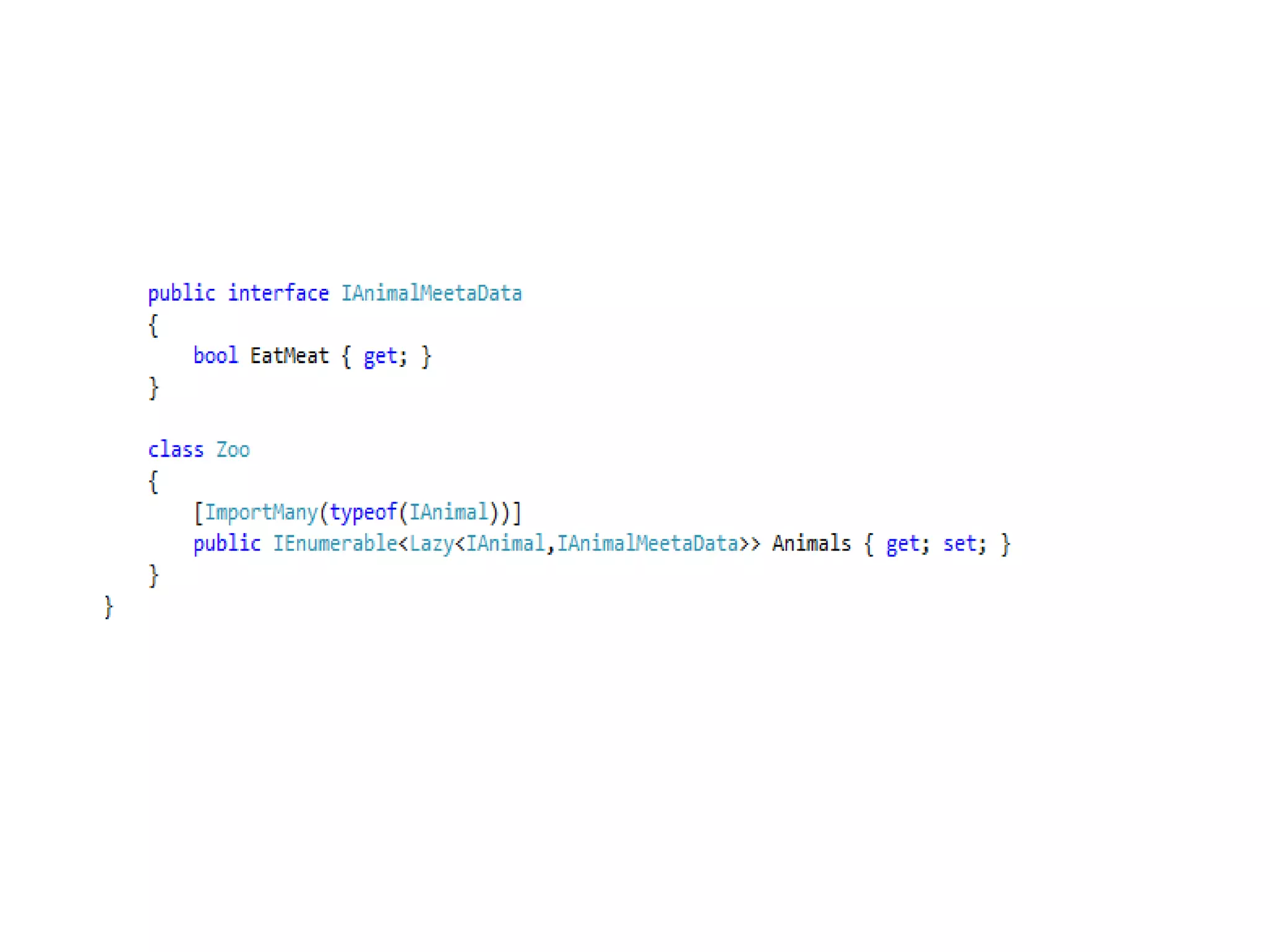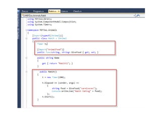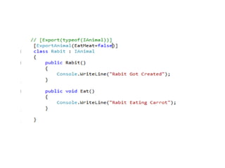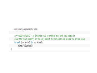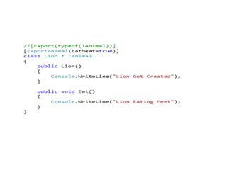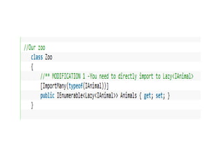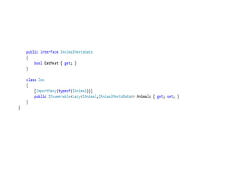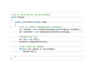 The document demonstrates using MEF to load animal components into a zoo application. Classes that implement the IAnimal interface are exported. The zoo imports the animals using MEF.